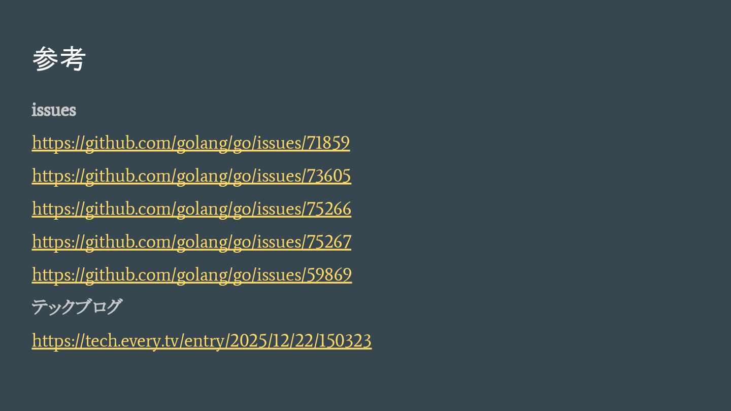 参考 issues https://github.com/golang/go/issues/71859 https://github.com/golang/go/issues/73605 https://github.com/golang/go/issues/75266 https://github.com/golang/go/issues/75267 https://github.com/golang/go/issues/59869 テックブログ https://tech.every.tv/entry/2025/12/22/150323