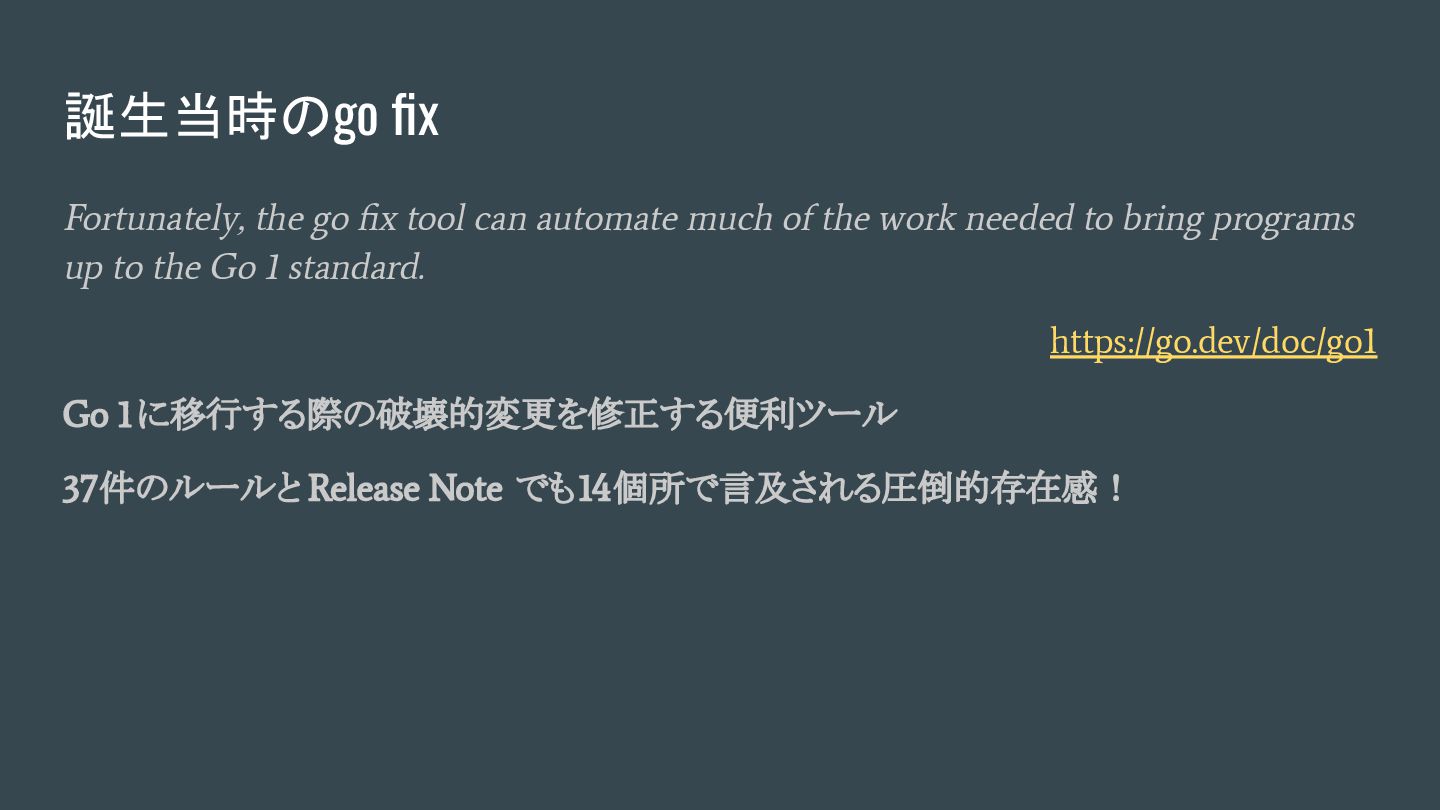 work needed to bring programs up to the Go 1 standard. https://go.dev/doc/go1 Go 1に移行する際の破壊的変更を修正する便利ツール 37件のルールと Release Note でも14個所で言及される圧倒的存在感! 誕生当時のgo fix