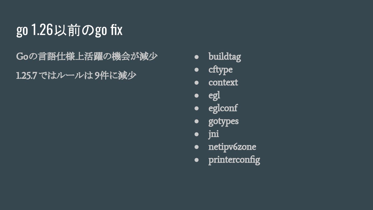• gotypes • jni • netipv6zone • printerconfig go 1.26以前のgo fix Goの言語仕様上活躍の機会が減少 1.25.7 ではルールは 9件に減少