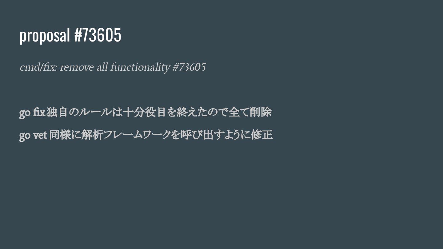 proposal #73605 cmd/fix: remove all functionality #73605 go fix独自のルールは十分役目を終えたので全て削除 go