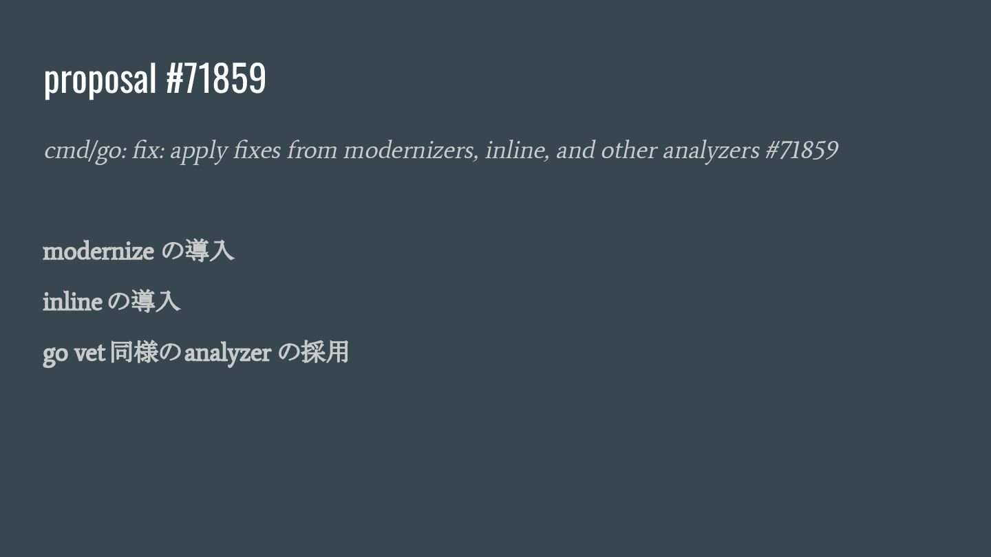 #71859 modernize の導入 inline の導入 go vet 同様のanalyzer の採用 proposal #71859