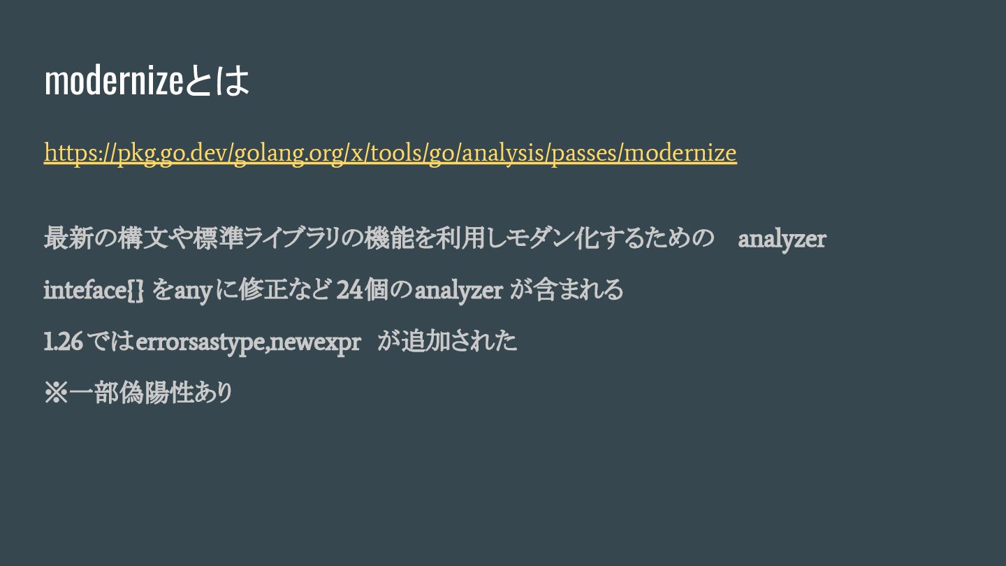https://pkg.go.dev/golang.org/x/tools/go/analysis/passes/modernize 最新の構文や標準ライブラリの機能を利用しモダン化するための analyzer inteface{} をanyに修正など 24個のanalyzer が含まれる 1.26ではerrorsastype,newexpr が追加された ※一部偽陽性あり