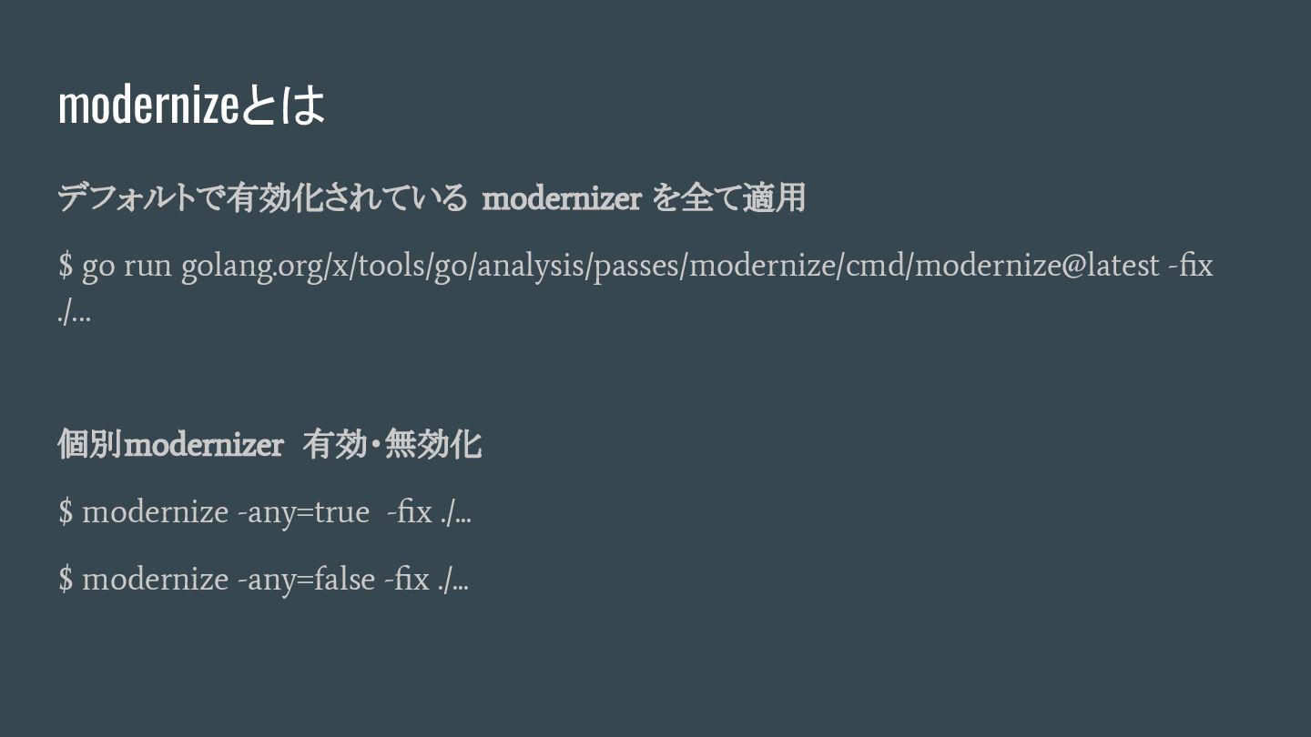 有効・無効化 $ modernize -any=true -fix ./... $ modernize -any=false -fix ./... modernizeとは