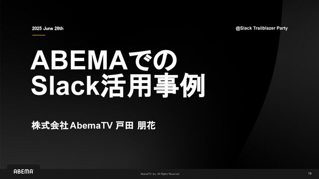 Reserved 19 ABEMAでの Slack活用事例 2025 June 26th 株式会社AbemaTV 戸田 朋花 @Slack Trailblazer Party
