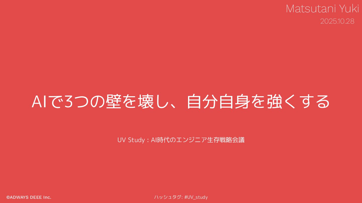 ©ADWAYS DEEE Inc. ハッシュタグ: #UV_study AIで3つの壁を壊し、自分自身を強くする UV Study : AI時代のエンジニア生存戦略会議