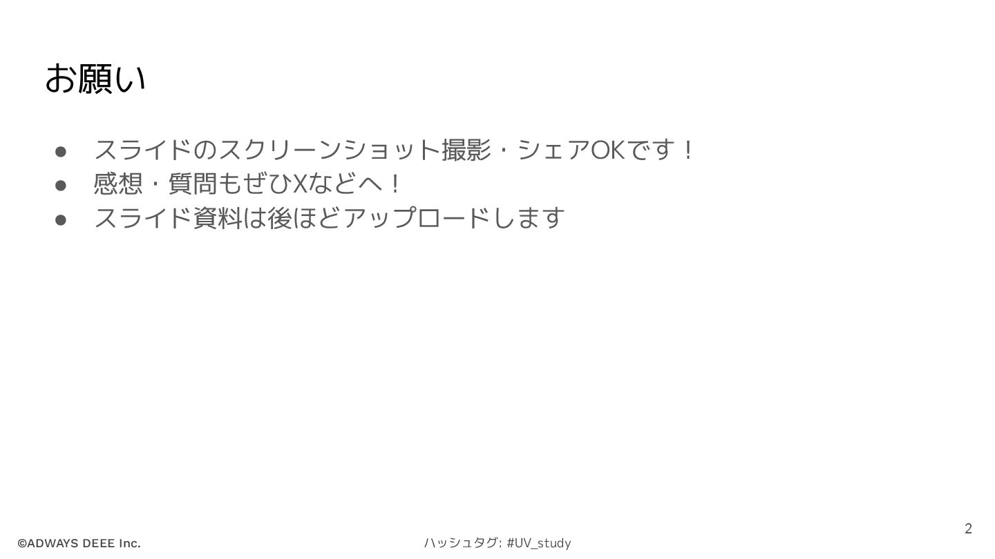 ©ADWAYS DEEE Inc. ハッシュタグ: #UV_study お願い • スライドのスクリーンショット撮影・シェアOKです! • 感想・質問もぜひXなどへ!