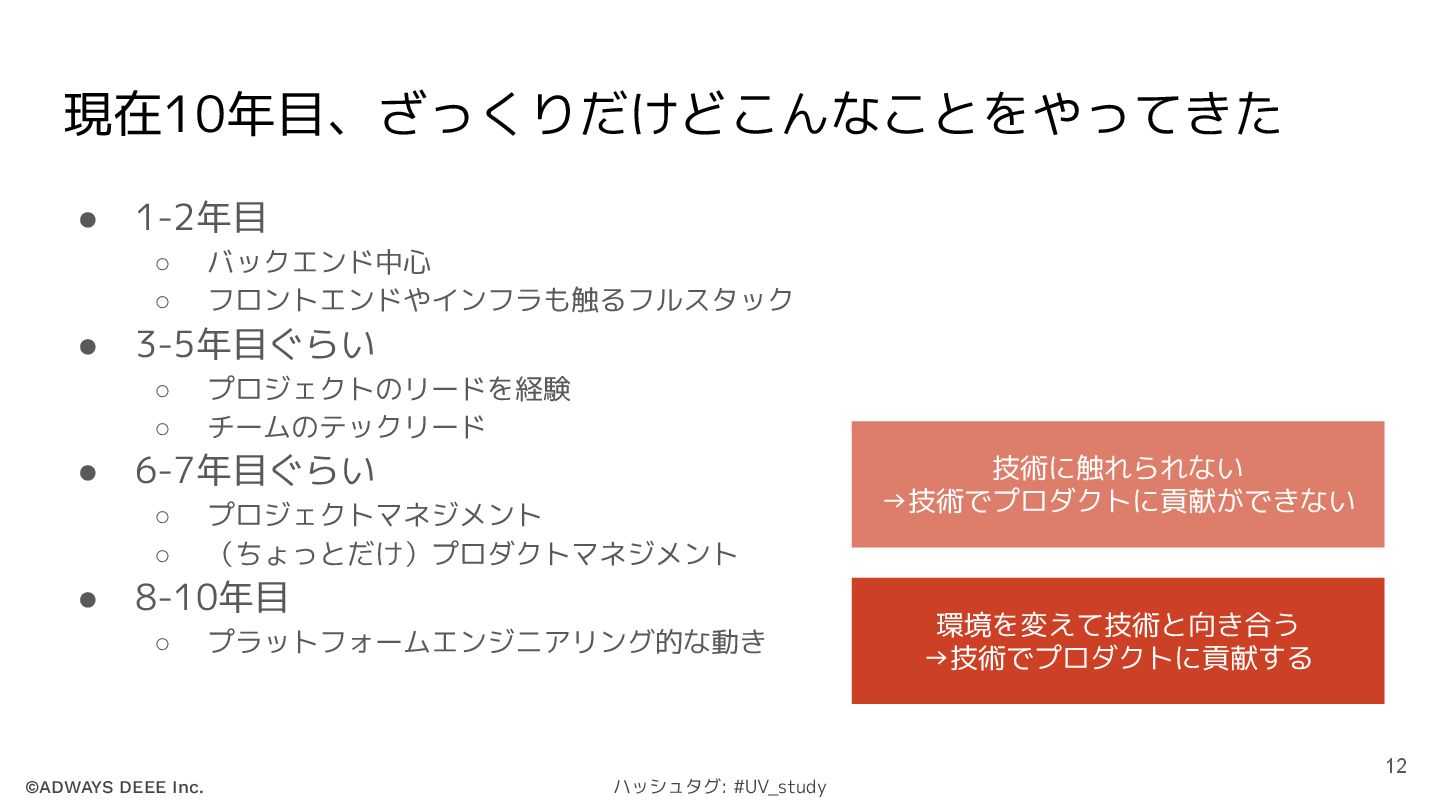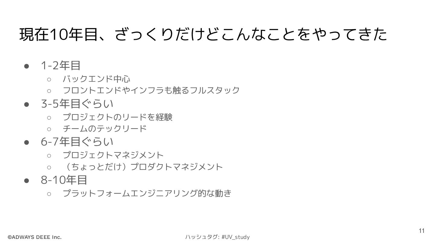 ©ADWAYS DEEE Inc. ハッシュタグ: #UV_study 現在10年目、ざっくりだけどこんなことをやってきた • 1-2年目 ◦ バックエンド中心
