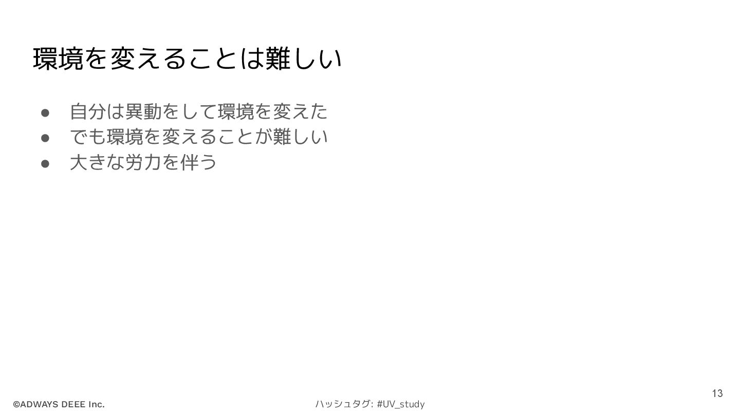 ©ADWAYS DEEE Inc. ハッシュタグ: #UV_study 環境を変えることは難しい • 自分は異動をして環境を変えた • でも環境を変えることが難しい