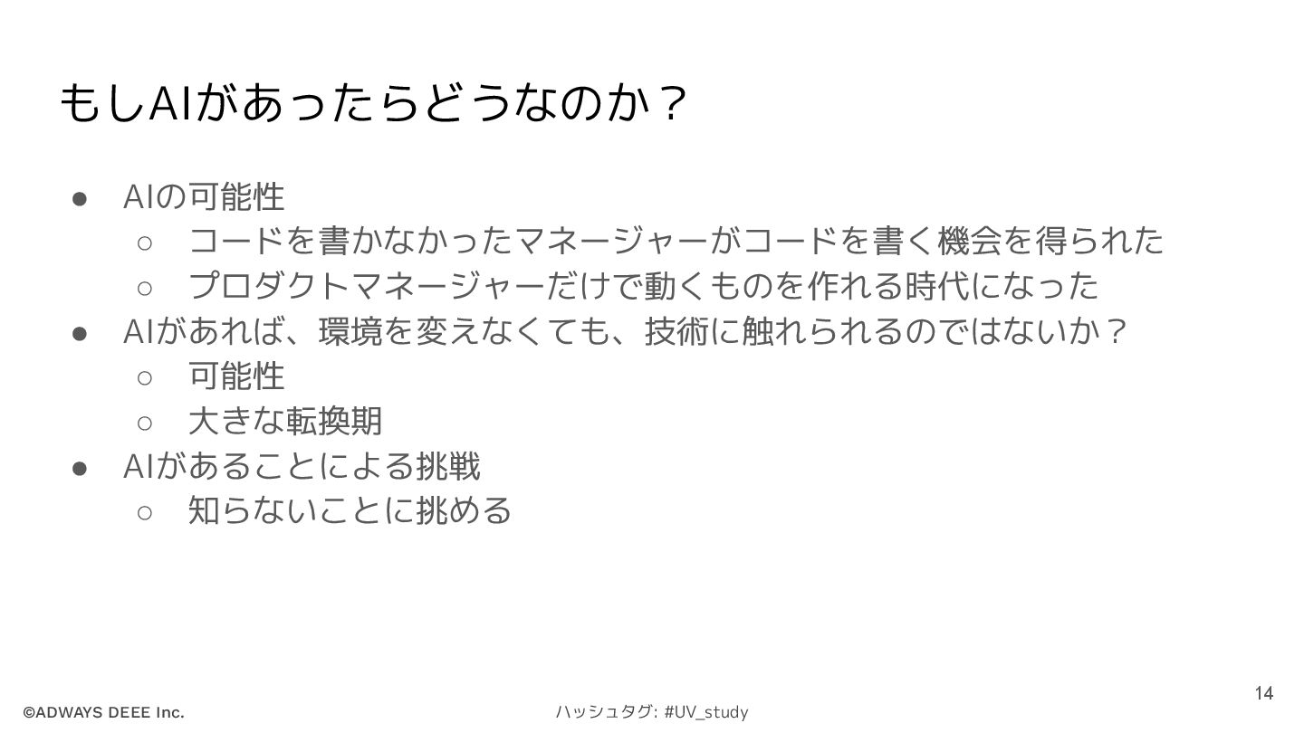 ©ADWAYS DEEE Inc. ハッシュタグ: #UV_study もしAIがあったらどうなのか? • AIの可能性 ◦ コードを書かなかったマネージャーがコードを書く機会を得られた