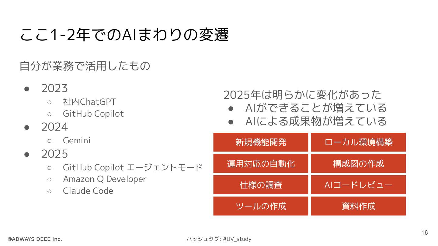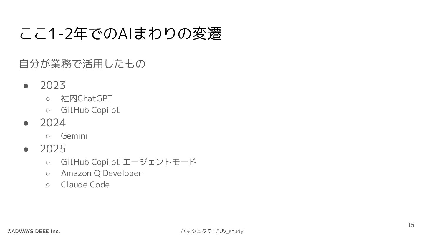 ©ADWAYS DEEE Inc. ハッシュタグ: #UV_study ここ1-2年でのAIまわりの変遷 自分が業務で活用したもの • 2023 ◦