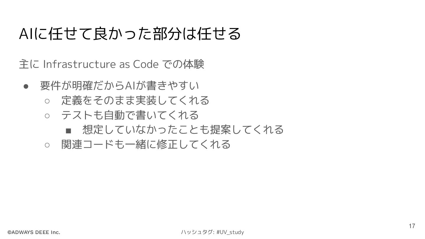 ©ADWAYS DEEE Inc. ハッシュタグ: #UV_study AIに任せて良かった部分は任せる 主に Infrastructure as Code