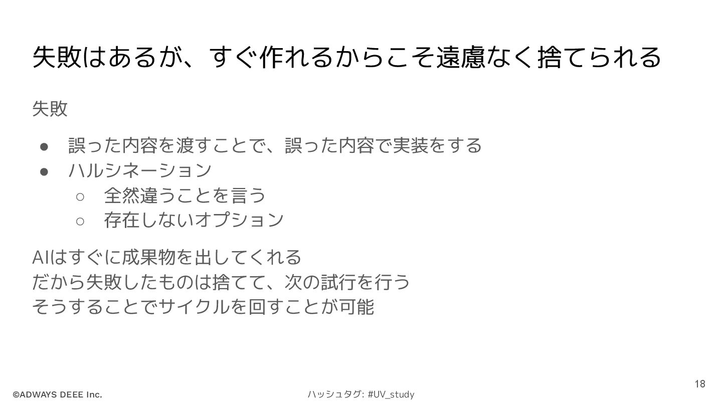 ©ADWAYS DEEE Inc. ハッシュタグ: #UV_study 失敗はあるが、すぐ作れるからこそ遠慮なく捨てられる 失敗 • 誤った内容を渡すことで、誤った内容で実装をする •