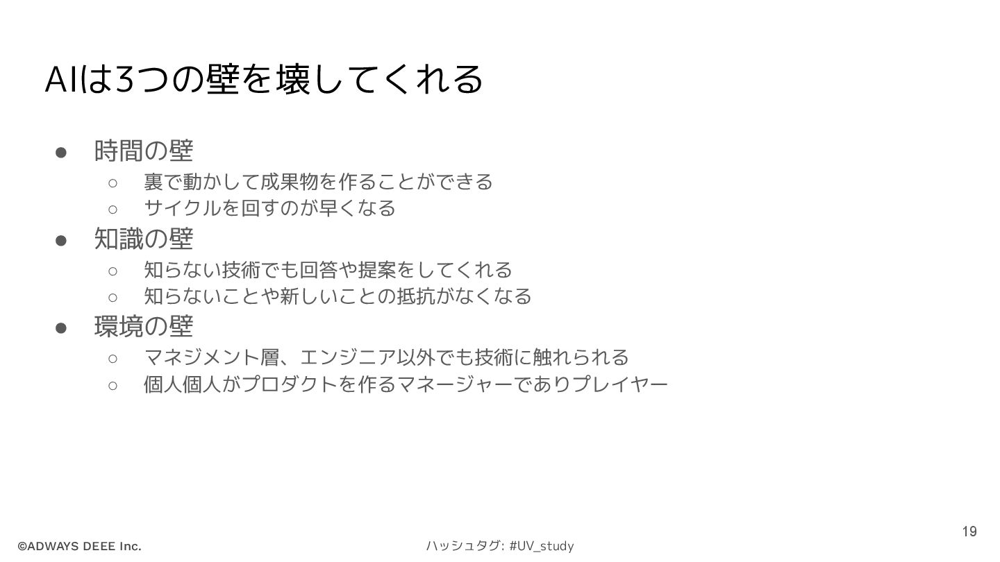 ©ADWAYS DEEE Inc. ハッシュタグ: #UV_study AIは3つの壁を壊してくれる • 時間の壁 ◦ 裏で動かして成果物を作ることができる