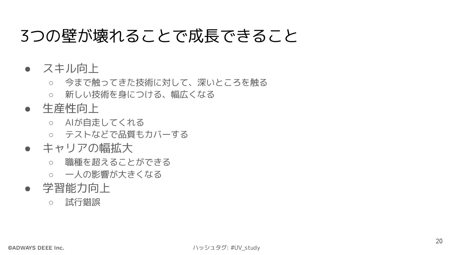 ©ADWAYS DEEE Inc. ハッシュタグ: #UV_study 3つの壁が壊れることで成長できること • スキル向上 ◦ 今まで触ってきた技術に対して、深いところを触る
