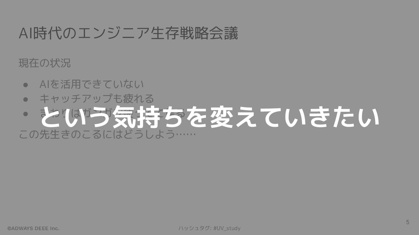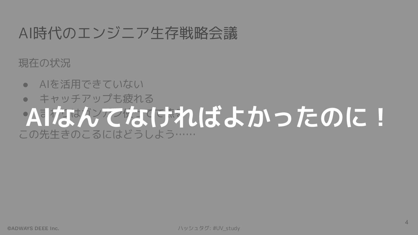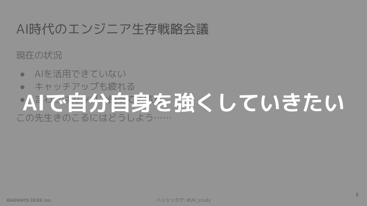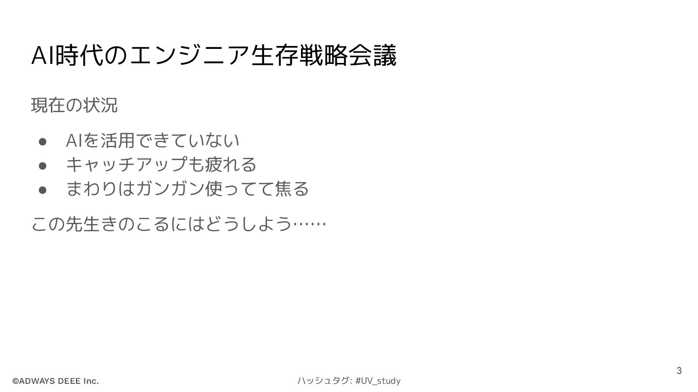 ©ADWAYS DEEE Inc. ハッシュタグ: #UV_study AI時代のエンジニア生存戦略会議 現在の状況 • AIを活用できていない •