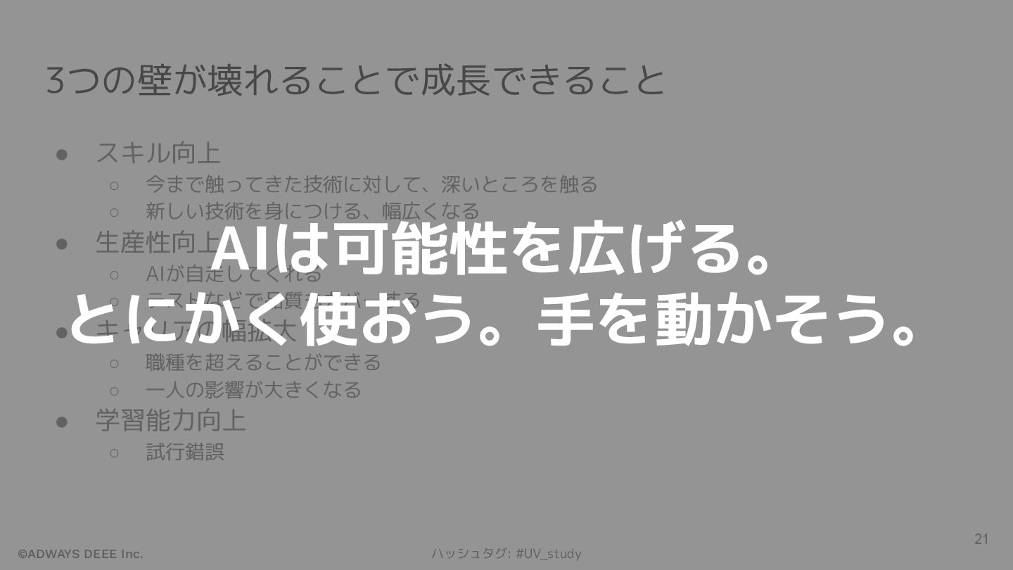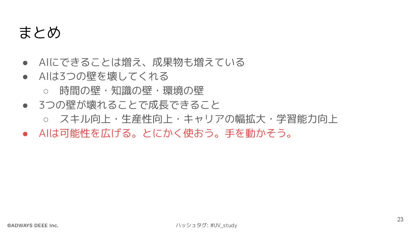 ©ADWAYS DEEE Inc. ハッシュタグ: #UV_study まとめ • AIにできることは増え、成果物も増えている • AIは3つの壁を壊してくれる