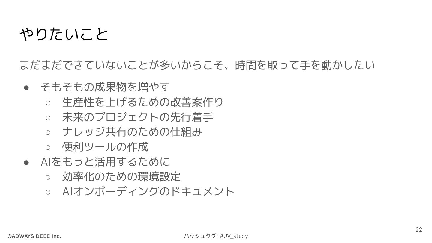 ©ADWAYS DEEE Inc. ハッシュタグ: #UV_study やりたいこと まだまだできていないことが多いからこそ、時間を取って手を動かしたい • そもそもの成果物を増やす ◦