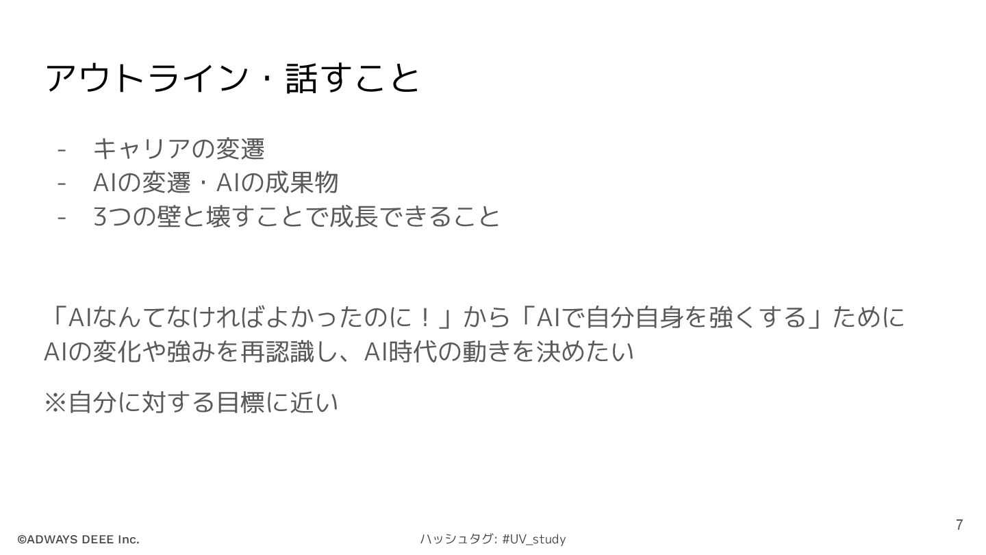 ©ADWAYS DEEE Inc. ハッシュタグ: #UV_study アウトライン・話すこと - キャリアの変遷 - AIの変遷・AIの成果物