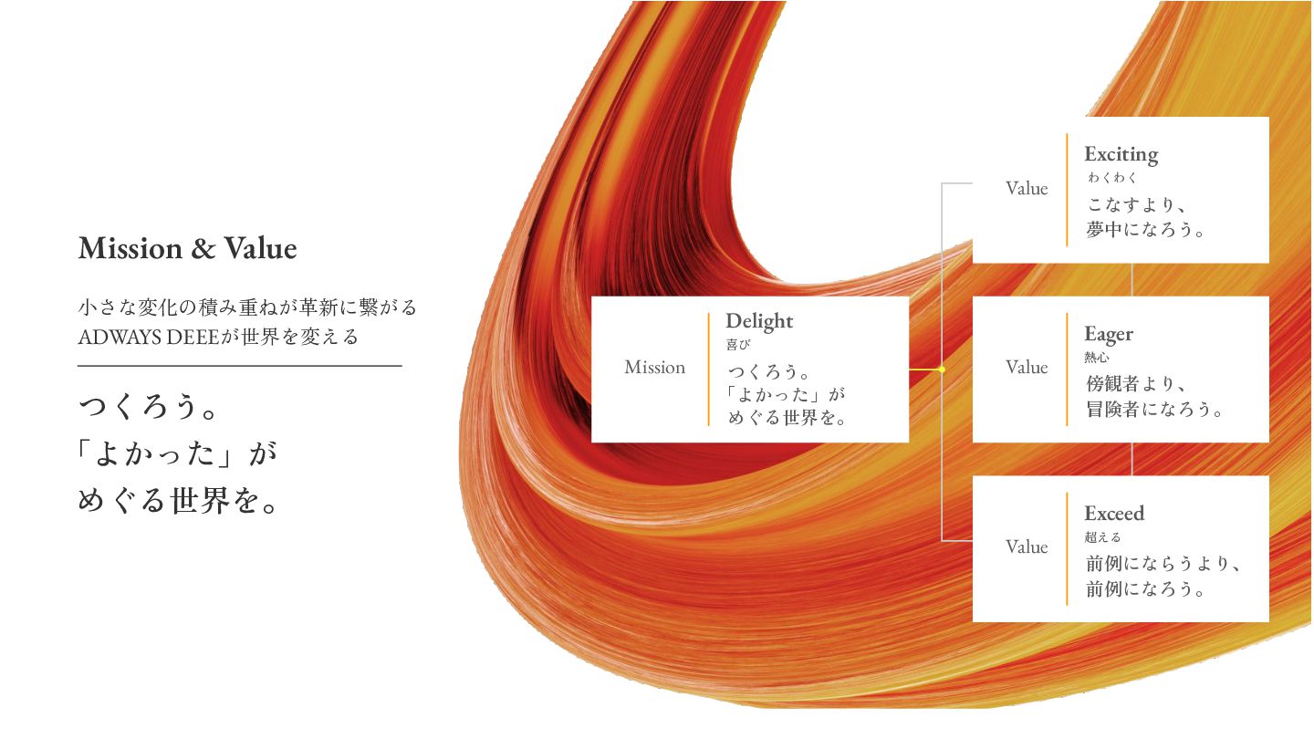 めぐる世界を。 Value Exciting わくわく こなすより、 夢中になろう。 Value Eager 熱心 傍観者より、 冒険者になろう。 Value Exceed 超える 前例にならうより、 前例になろう。 Mission & Value めぐる世界を。 小さな変化の積み重ねが革新に繋がる ADWAYS DEEEが世界を変える つくろう。 「よかった」が