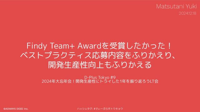©ADWAYS DEEE Inc. ハッシュタグ: #でぃーぷらすトウキョウ 本日話すこと ”2024年大忘年会!開発生産性にトライした1年を振り返ろうLT会 ” Findy Team+