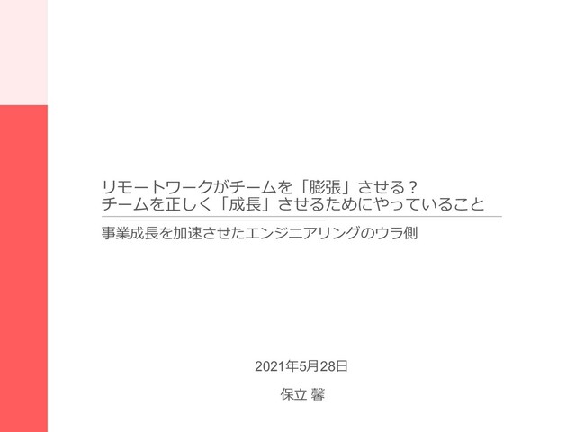 MedPeer, Inc. リモートワークがチームを「膨張」させる︖ チームを正しく「成⻑」させるためにやっていること 事業成⻑を加速させたエンジニアリングのウラ側 2021年5⽉28⽇ 保⽴ 馨