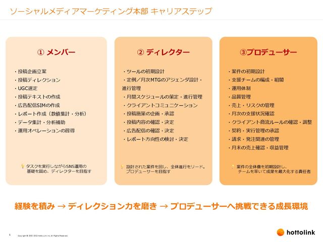 キャリアステップ 1 経験を積み → ディレクション力を磨き → プロデューサーへ挑戦できる成長環境 ① メンバー ・投稿企画立案 ・投稿ディレクション ・UGC選定 ・投稿テキストの作成 ・広告配信SIMの作成 ・レポート作成(数値集計・分析) ・データ集計・分析補助 ・運用オペレーションの習得 タスクを実行しながらSNS運用の 基礎を固め、ディレクターを目指す ② ディレクター ・ツールの初期設計 ・定例/月次MTGのアジェンダ設計・ 進行管理 ・月間スケジュールの策定・進行管理 ・クライアントコミュニケーション ・投稿施策の企画・承認 ・投稿内容の確認・決定 ・広告配信の確認・決定 ・レポート方向性の検討・決定 設計された案件を回し、全体進行をリード。 プロデューサーを目指す ③プロデューサー ・案件の初期設計 ・支援チームの編成・組閣 ・運用体制 ・品質管理 ・売上・リスクの管理 ・月次の支援状況確認 ・クライアント商流ルールの確認・調整 ・契約・実行管理の承認 ・請求・発注関連の管理 ・月末の売上確認・収益管理 案件の全体像を初期設計し、 チームを率いて成果を最大化する責任者