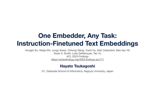 of Informatics, Nagoya University, Japan Hayato Tsukagoshi Hongjin Su, Weijia Shi, Jungo Kasai, Yizhong Wang, Yushi Hu, Mari Ostendorf, Wen-tau Yih Noah A. Smith, Luke Zettlemoyer, Tao Yu ACL 2023 Findings https://aclanthology.org/2023. fi ndings-acl.71/