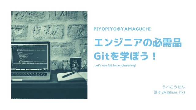 PIYOPIYO@YAMAGUCHI Let's use Git for engineering! エンジニアの必需品 Gitを学ぼう! うべこうせん はすみ(@hsm_hx)