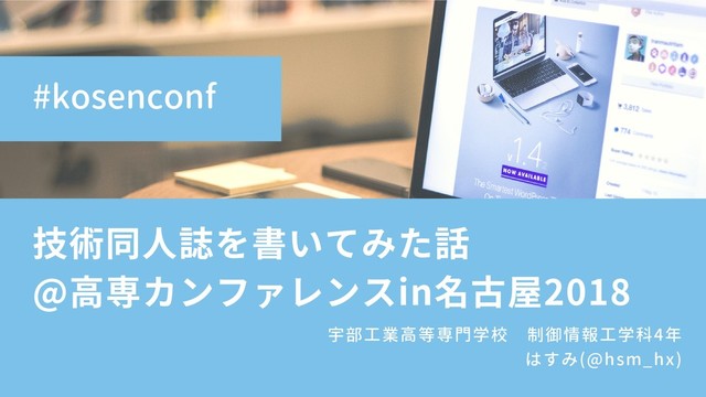 技術同⼈誌を書いてみた話 @⾼専カンファレンスin名古屋2018 宇部工業高等専門学校 制御情報工学科4年 はすみ(@hsm_hx) #kosenconf