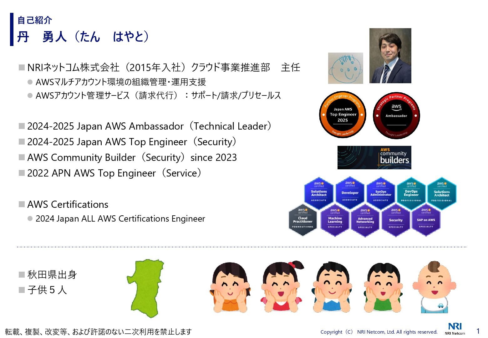 勇人(たん はやと) 自己紹介 ◼ NRIネットコム株式会社(2015年入社)クラウド事業推進部 主任 ⚫ AWSマルチアカウント環境の組織管理・運用支援 ⚫ AWSアカウント管理サービス(請求代行):サポート/請求/プリセールス ◼ 2024-2025 Japan AWS Ambassador(Technical Leader) ◼ 2024-2025 Japan AWS Top Engineer(Security) ◼ AWS Community Builder(Security)since 2023 ◼ 2022 APN AWS Top Engineer(Service) ◼ AWS Certifications ⚫ 2024 Japan ALL AWS Certifications Engineer ◼ 秋田県出身 ◼ 子供5人
