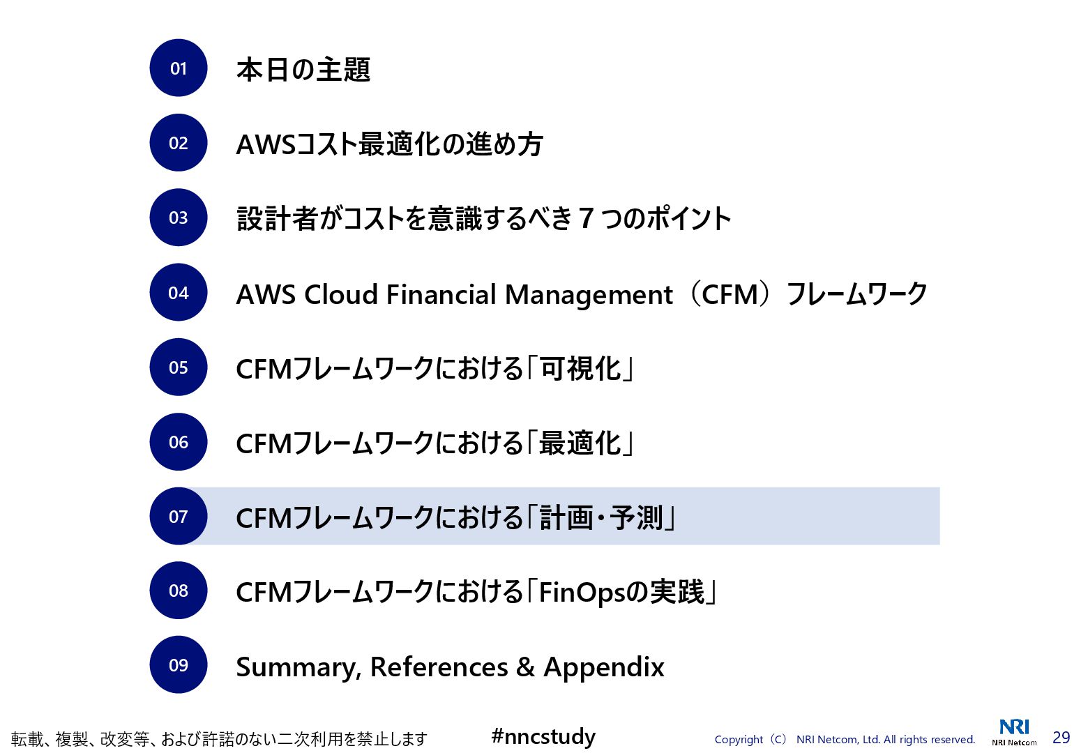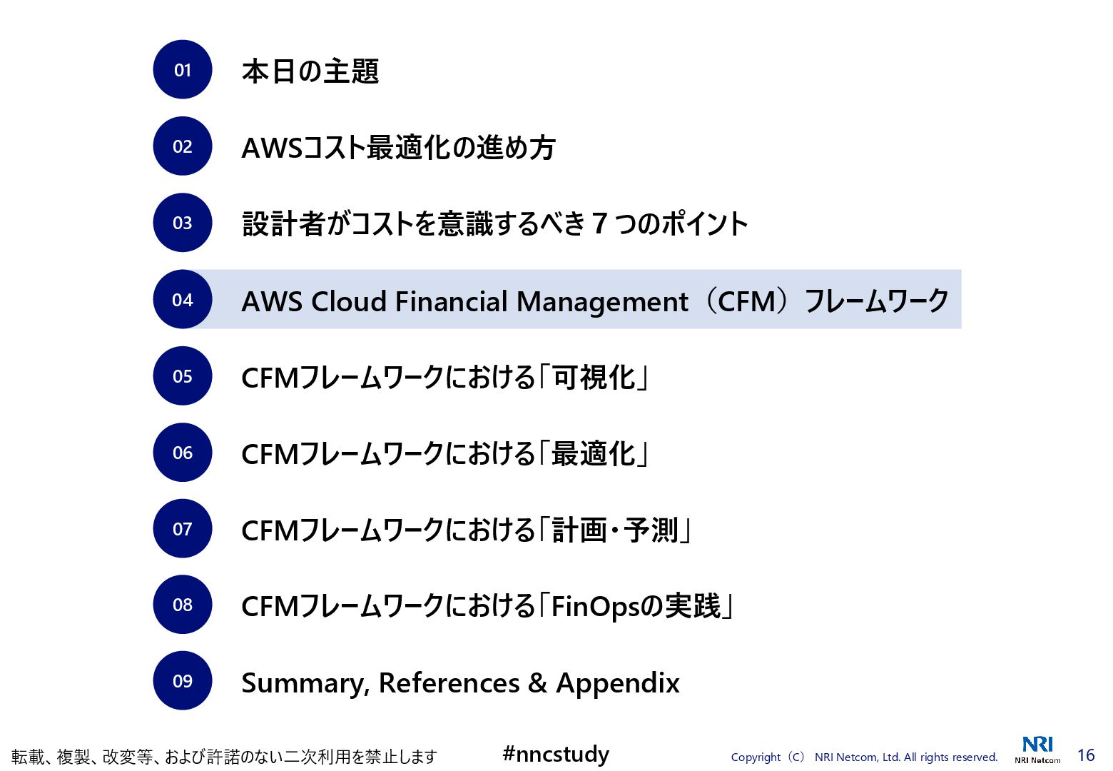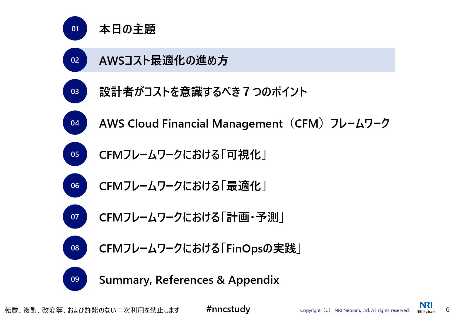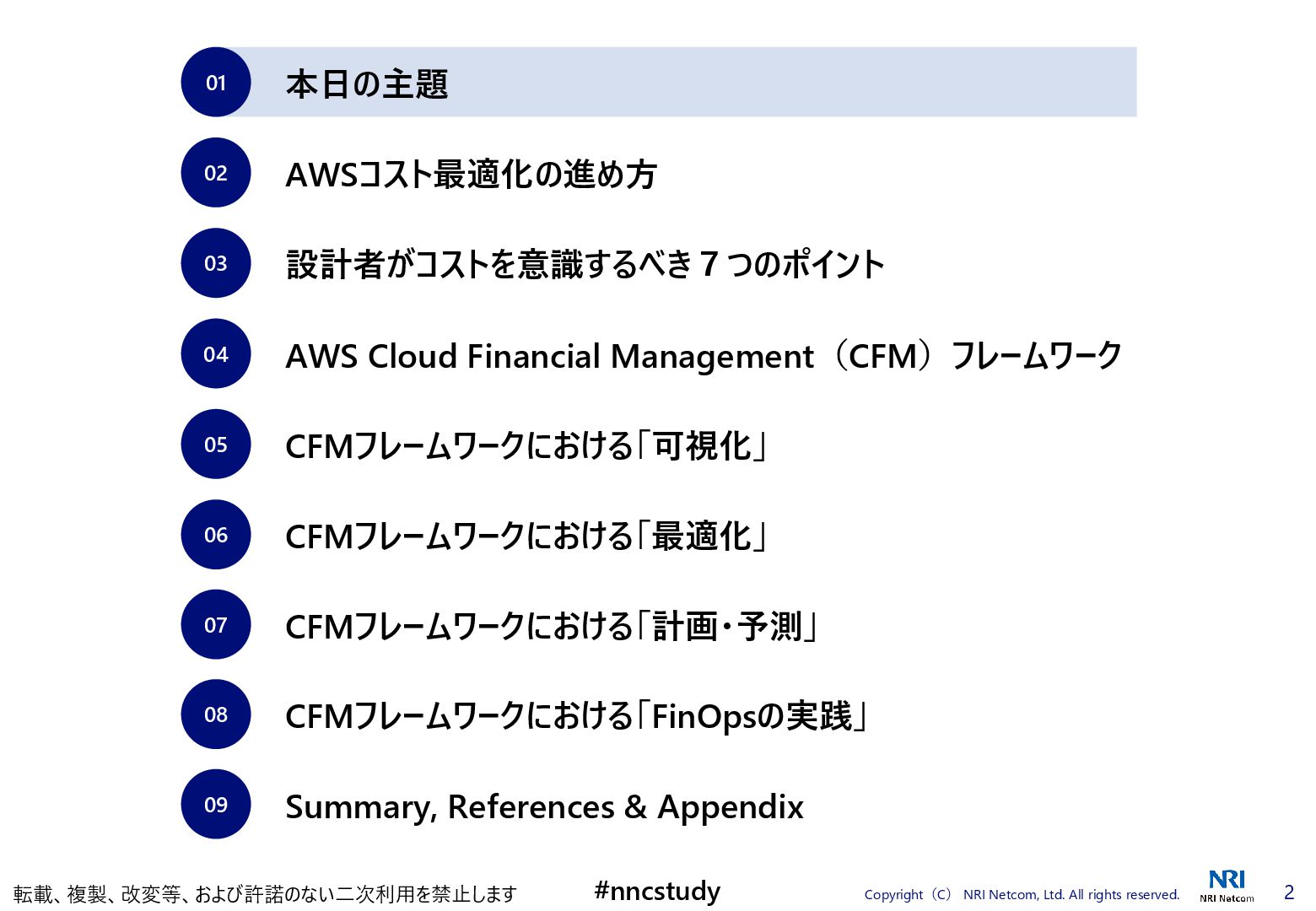 本日の主題 01 AWSコスト最適化の進め方 02 設計者がコストを意識するべき7つのポイント 03 AWS Cloud Financial Management(CFM)フレームワーク 04 CFMフレームワークにおける「可視化」 05 CFMフレームワークにおける「最適化」 06 CFMフレームワークにおける「計画・予測」 07 CFMフレームワークにおける「FinOpsの実践」 08 Summary, References & Appendix 09
