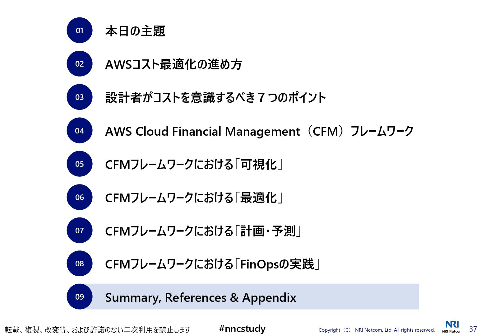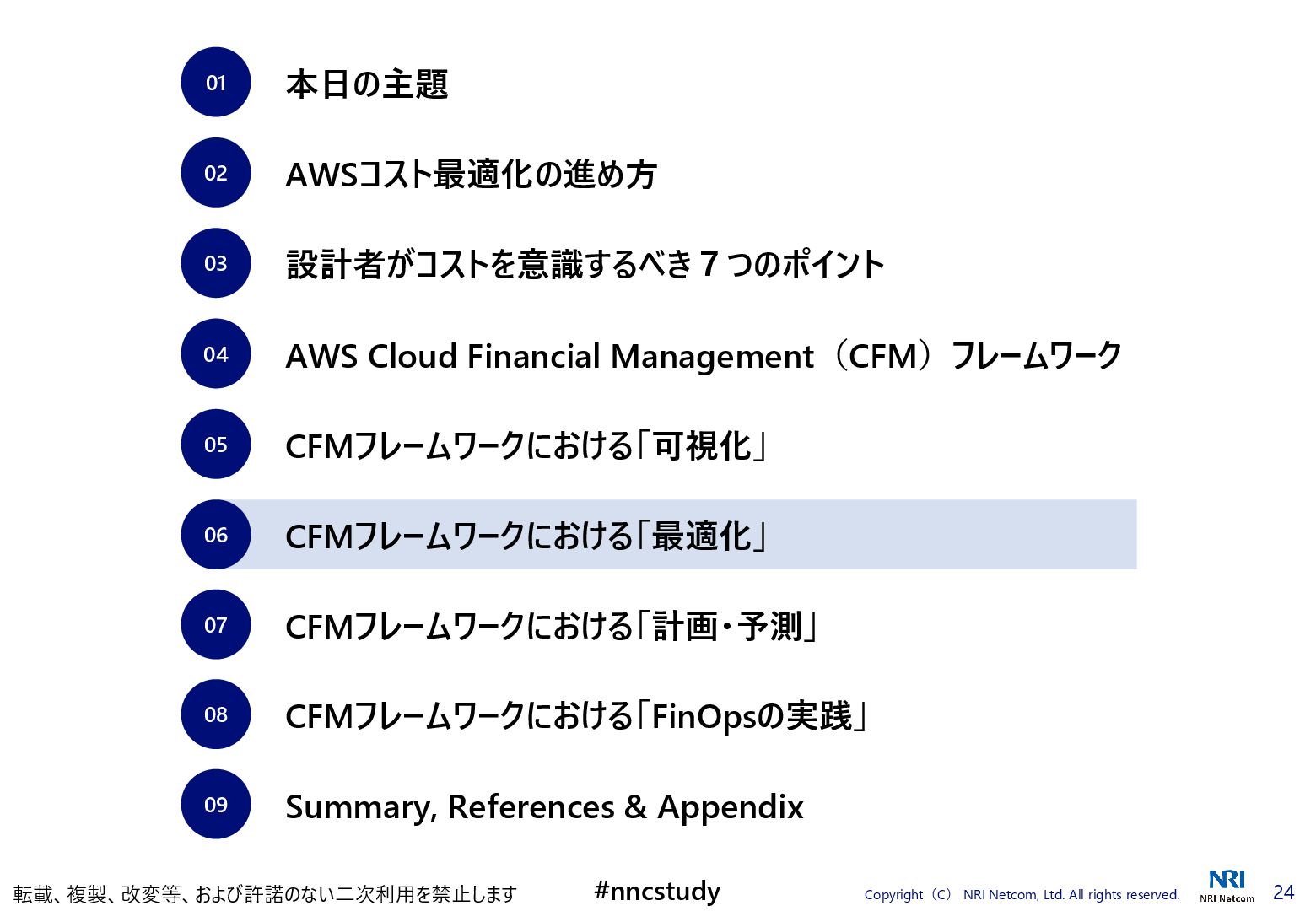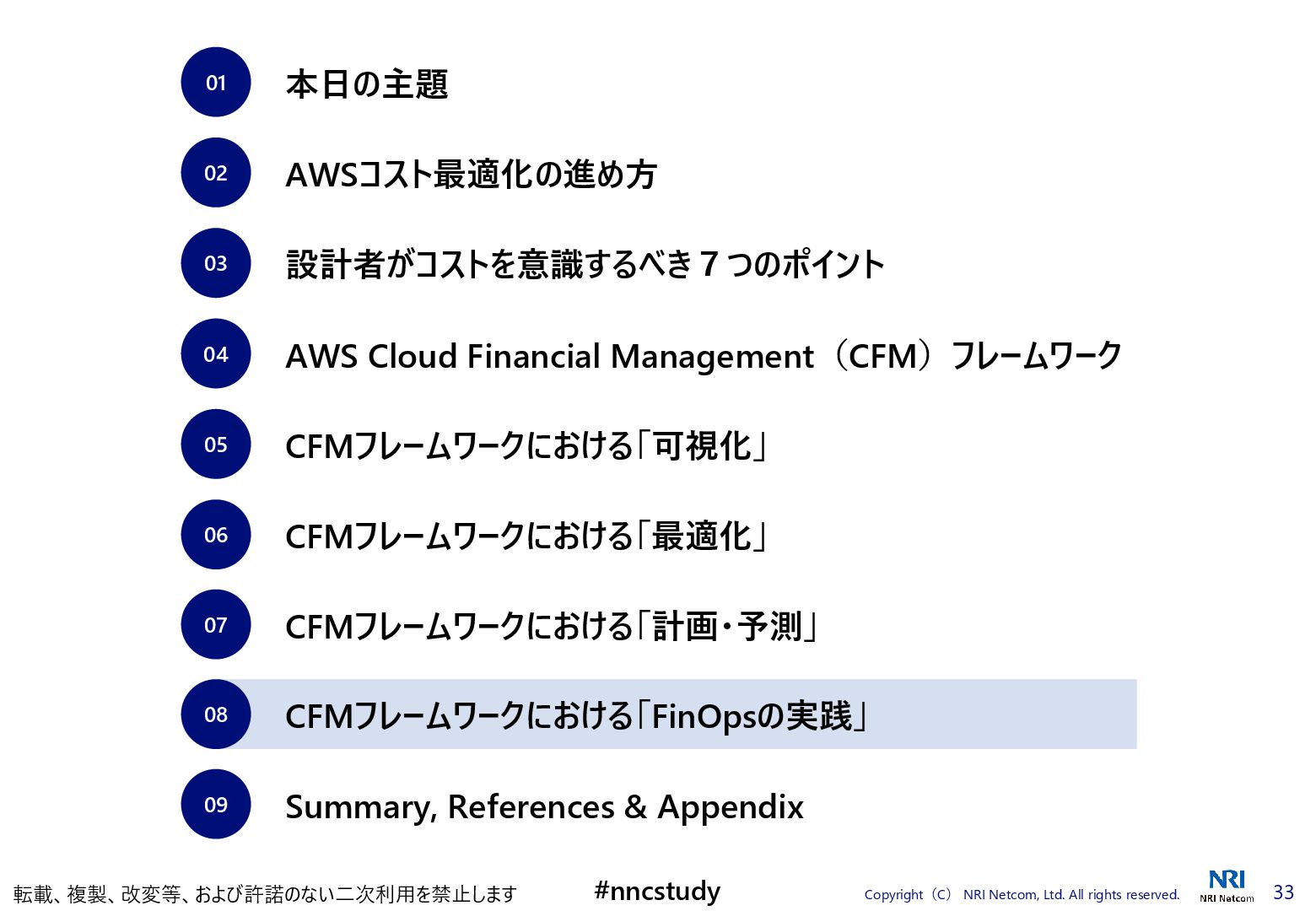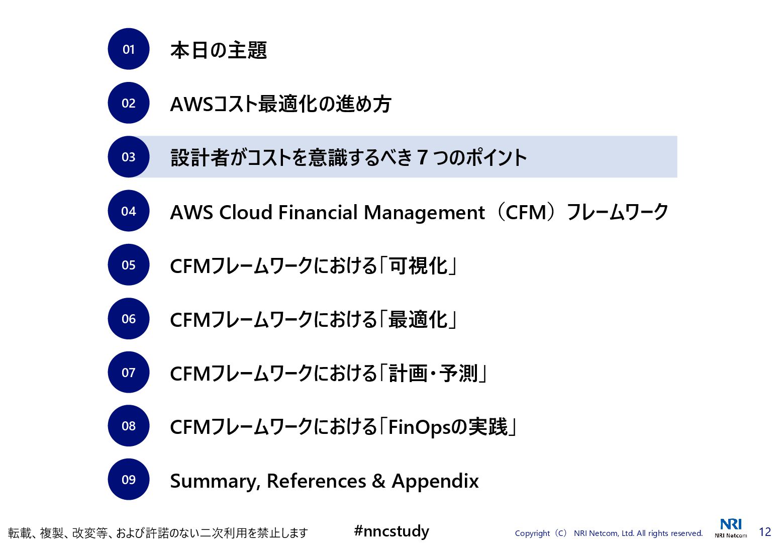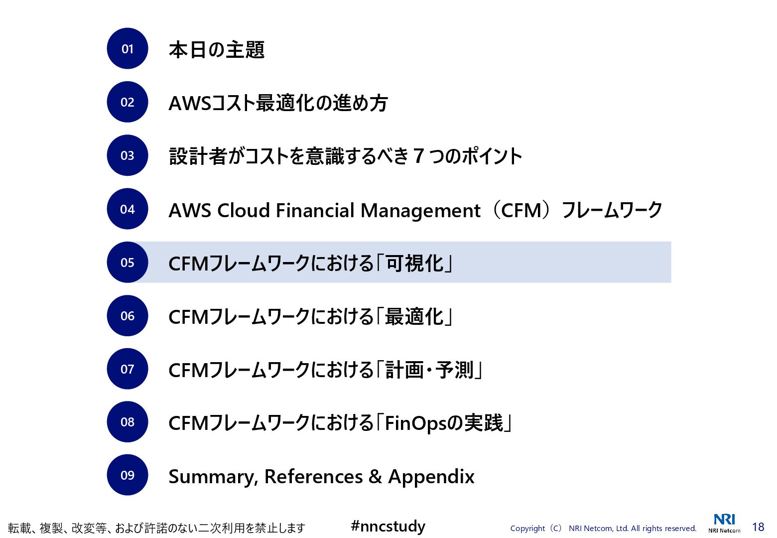本日の主題 01 AWSコスト最適化の進め方 02 設計者がコストを意識するべき7つのポイント 03 AWS Cloud Financial Management(CFM)フレームワーク 04 CFMフレームワークにおける「可視化」 05 CFMフレームワークにおける「最適化」 06 CFMフレームワークにおける「計画・予測」 07 CFMフレームワークにおける「FinOpsの実践」 08 Summary, References & Appendix 09