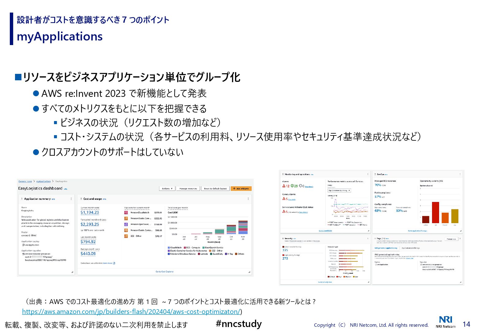myApplications 設計者がコストを意識するべき7つのポイント ◼リソースをビジネスアプリケーション単位でグループ化 ⚫ AWS re:Invent 2023 で新機能として発表 ⚫ すべてのメトリクスをもとに以下を把握できる ▪ビジネスの状況(リクエスト数の増加など) ▪コスト・システムの状況(各サービスの利用料、リソース使用率やセキュリティ基準達成状況など) ⚫ クロスアカウントのサポートはしていない (出典:AWS でのコスト最適化の進め方 第 1 回 ~ 7 つのポイントとコスト最適化に活用できる新ツールとは ? https://aws.amazon.com/jp/builders-flash/202404/aws-cost-optimizaton/)