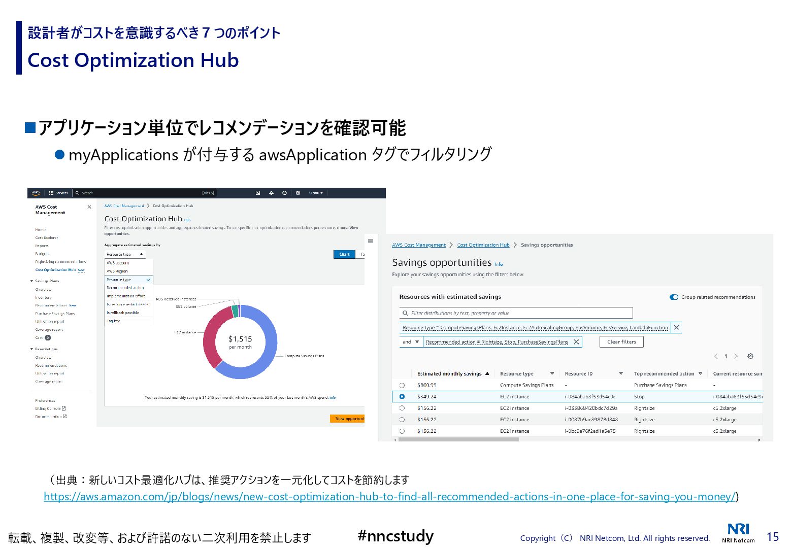 Cost Optimization Hub 設計者がコストを意識するべき7つのポイント ◼アプリケーション単位でレコメンデーションを確認可能 ⚫ myApplications が付与する awsApplication タグでフィルタリング (出典:新しいコスト最適化ハブは、推奨アクションを一元化してコストを節約します https://aws.amazon.com/jp/blogs/news/new-cost-optimization-hub-to-find-all-recommended-actions-in-one-place-for-saving-you-money/)