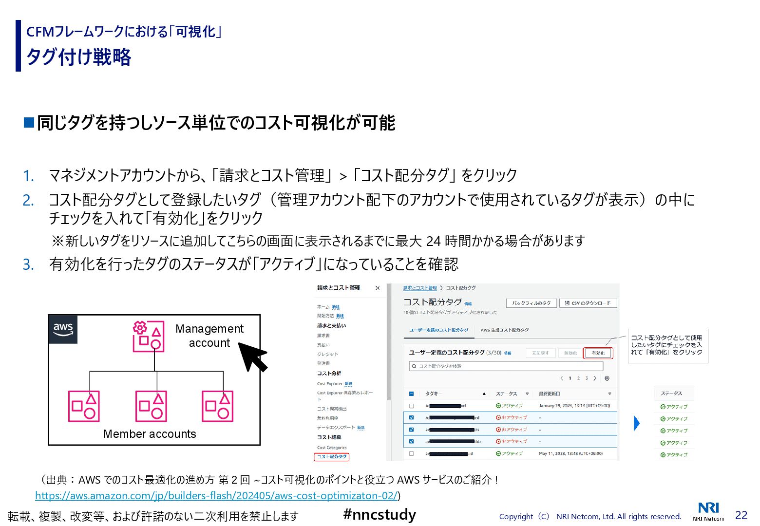 タグ付け戦略 CFMフレームワークにおける「可視化」 ◼同じタグを持つしソース単位でのコスト可視化が可能 1. マネジメントアカウントから、「請求とコスト管理」 > 「コスト配分タグ」 をクリック 2. コスト配分タグとして登録したいタグ(管理アカウント配下のアカウントで使用されているタグが表示)の中に チェックを入れて「有効化」をクリック ※新しいタグをリソースに追加してこちらの画面に表示されるまでに最大 24 時間かかる場合があります 3. 有効化を行ったタグのステータスが「アクティブ」になっていることを確認 Management account Member accounts (出典:AWS でのコスト最適化の進め方 第2回 ~コスト可視化のポイントと役立つ AWS サービスのご紹介 ! https://aws.amazon.com/jp/builders-flash/202405/aws-cost-optimizaton-02/)