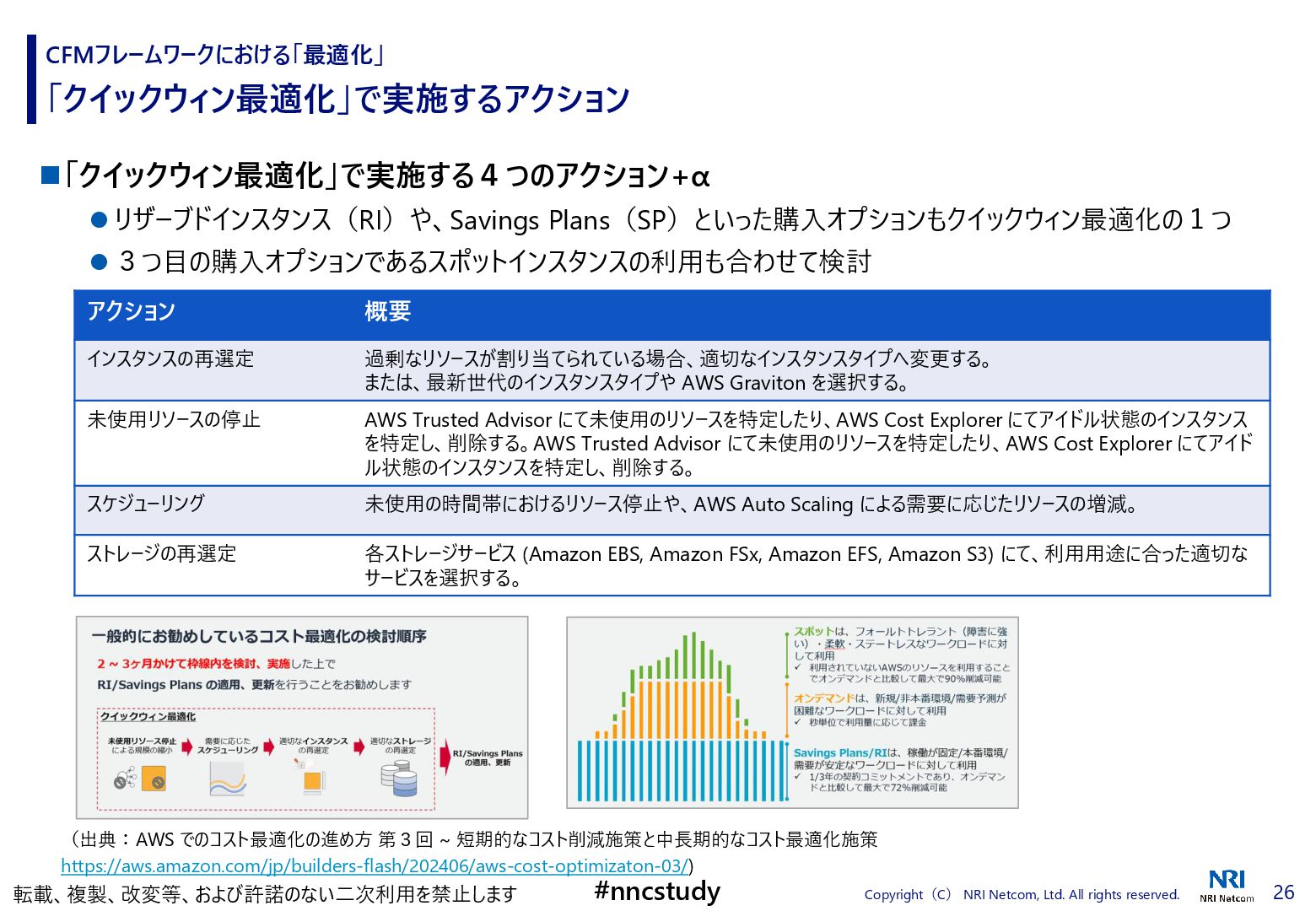 「クイックウィン最適化」で実施するアクション CFMフレームワークにおける「最適化」 ◼「クイックウィン最適化」で実施する4つのアクション+α ⚫ リザーブドインスタンス(RI)や、Savings Plans(SP)といった購入オプションもクイックウィン最適化の1つ ⚫ 3つ目の購入オプションであるスポットインスタンスの利用も合わせて検討 アクション 概要 インスタンスの再選定 過剰なリソースが割り当てられている場合、適切なインスタンスタイプへ変更する。 または、最新世代のインスタンスタイプや AWS Graviton を選択する。 未使用リソースの停止 AWS Trusted Advisor にて未使用のリソースを特定したり、AWS Cost Explorer にてアイドル状態のインスタンス を特定し、削除する。AWS Trusted Advisor にて未使用のリソースを特定したり、AWS Cost Explorer にてアイド ル状態のインスタンスを特定し、削除する。 スケジューリング 未使用の時間帯におけるリソース停止や、AWS Auto Scaling による需要に応じたリソースの増減。 ストレージの再選定 各ストレージサービス (Amazon EBS, Amazon FSx, Amazon EFS, Amazon S3) にて、利用用途に合った適切な サービスを選択する。 (出典:AWS でのコスト最適化の進め方 第3回 ~ 短期的なコスト削減施策と中長期的なコスト最適化施策 https://aws.amazon.com/jp/builders-flash/202406/aws-cost-optimizaton-03/)