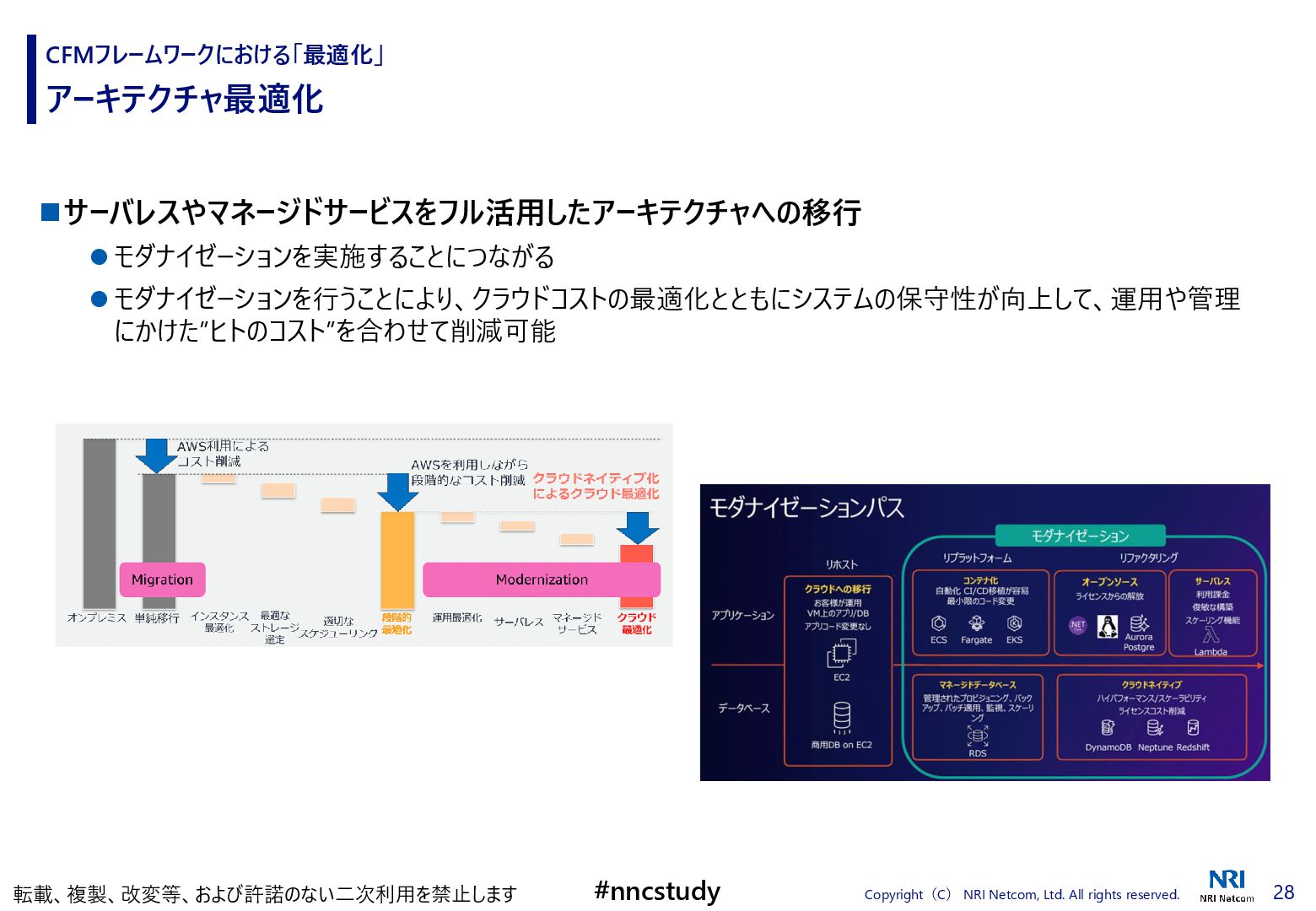 アーキテクチャ最適化 CFMフレームワークにおける「最適化」 ◼サーバレスやマネージドサービスをフル活用したアーキテクチャへの移行 ⚫ モダナイゼーションを実施することにつながる ⚫ モダナイゼーションを行うことにより、クラウドコストの最適化とともにシステムの保守性が向上して、運用や管理 にかけた”ヒトのコスト”を合わせて削減可能