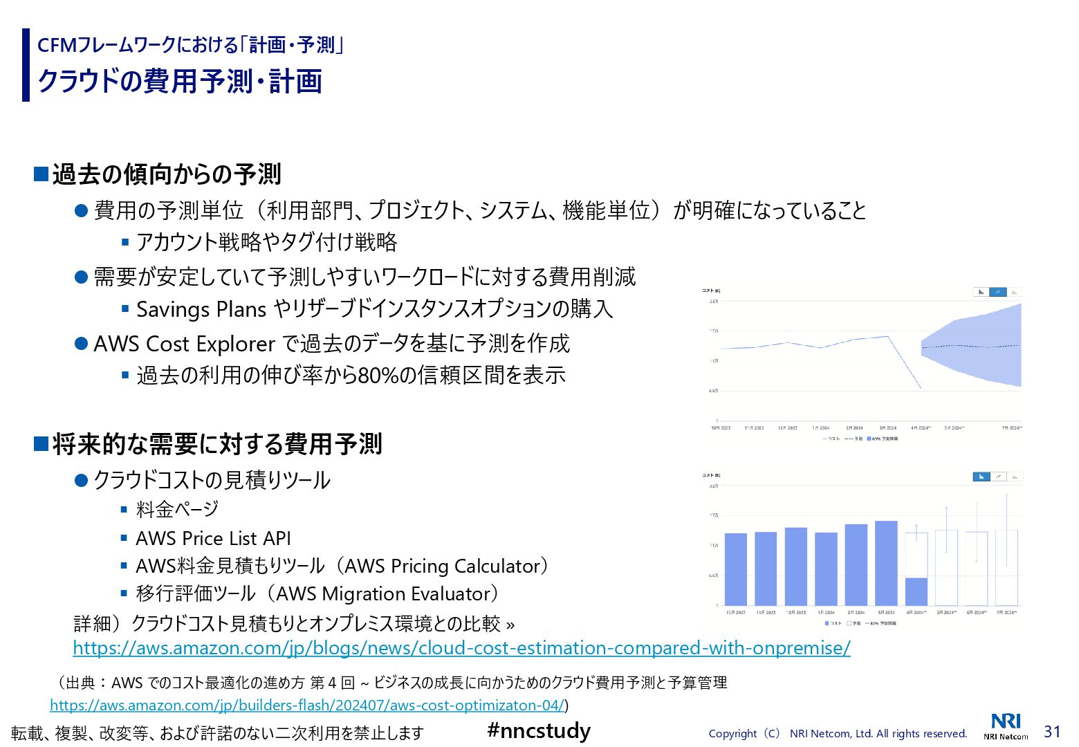 クラウドの費用予測・計画 CFMフレームワークにおける「計画・予測」 ◼過去の傾向からの予測 ⚫ 費用の予測単位(利用部門、プロジェクト、システム、機能単位)が明確になっていること ▪アカウント戦略やタグ付け戦略 ⚫ 需要が安定していて予測しやすいワークロードに対する費用削減 ▪Savings Plans やリザーブドインスタンスオプションの購入 ⚫ AWS Cost Explorer で過去のデータを基に予測を作成 ▪過去の利用の伸び率から80%の信頼区間を表示 ◼将来的な需要に対する費用予測 ⚫ クラウドコストの見積りツール ▪料金ページ ▪AWS Price List API ▪AWS料金見積もりツール(AWS Pricing Calculator) ▪移行評価ツール(AWS Migration Evaluator) 詳細)クラウドコスト見積もりとオンプレミス環境との比較 » https://aws.amazon.com/jp/blogs/news/cloud-cost-estimation-compared-with-onpremise/ (出典:AWS でのコスト最適化の進め方 第4回 ~ ビジネスの成長に向かうためのクラウド費用予測と予算管理 https://aws.amazon.com/jp/builders-flash/202407/aws-cost-optimizaton-04/)