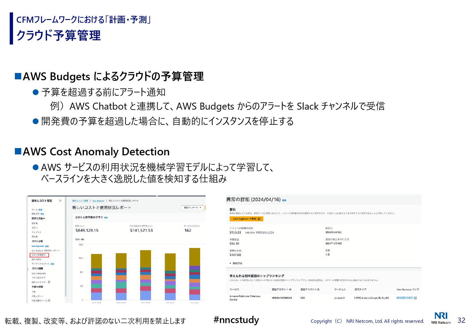クラウド予算管理 CFMフレームワークにおける「計画・予測」 ◼AWS Budgets によるクラウドの予算管理 ⚫ 予算を超過する前にアラート通知 例)AWS Chatbot と連携して、AWS Budgets からのアラートを Slack チャンネルで受信 ⚫ 開発費の予算を超過した場合に、自動的にインスタンスを停止する ◼AWS Cost Anomaly Detection ⚫ AWS サービスの利用状況を機械学習モデルによって学習して、 ベースラインを大きく逸脱した値を検知する仕組み