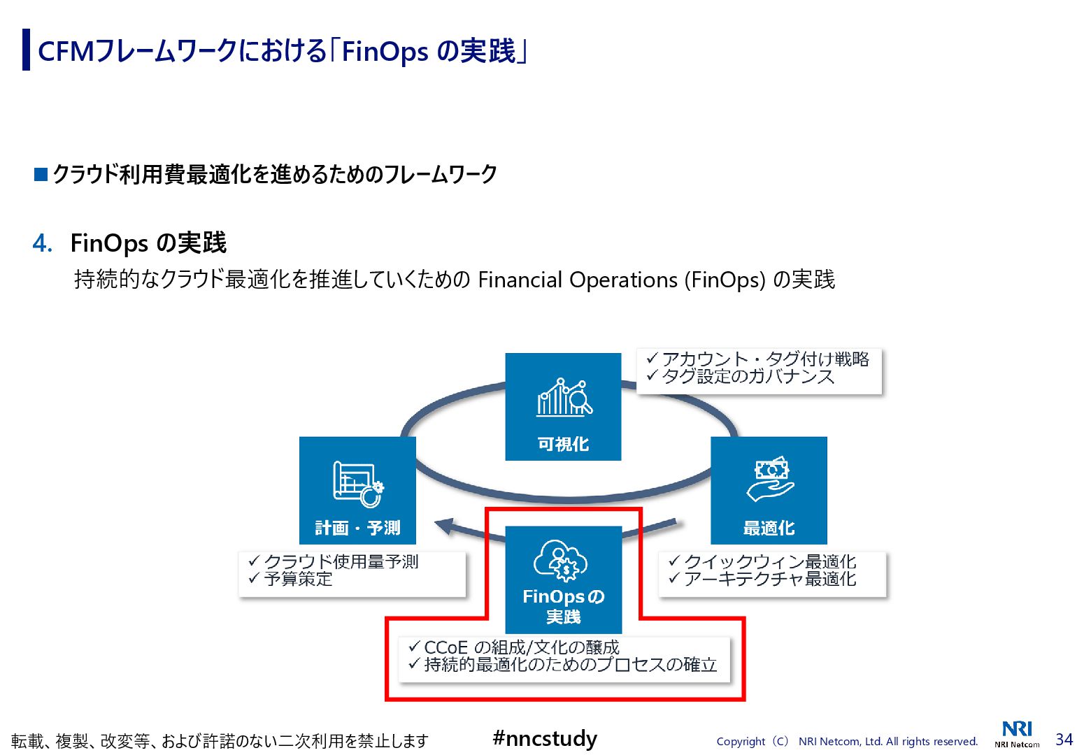 CFMフレームワークにおける「FinOps の実践」 ◼ クラウド利用費最適化を進めるためのフレームワーク 4. FinOps の実践 持続的なクラウド最適化を推進していくための Financial Operations (FinOps) の実践