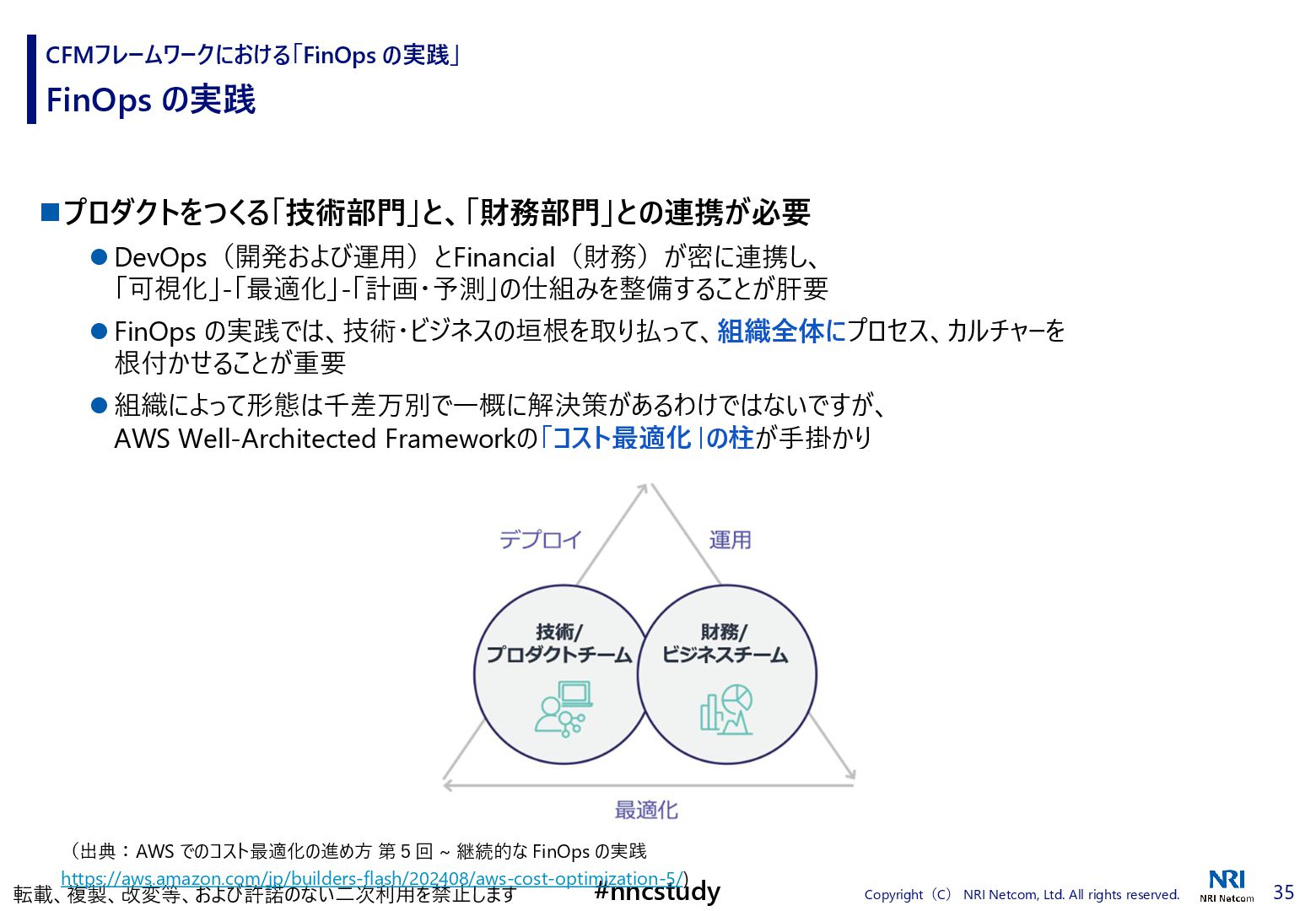 FinOps の実践 CFMフレームワークにおける「FinOps の実践」 ◼プロダクトをつくる「技術部門」と、「財務部門」との連携が必要 ⚫ DevOps(開発および運用)とFinancial(財務)が密に連携し、 「可視化」-「最適化」-「計画・予測」の仕組みを整備することが肝要 ⚫ FinOps の実践では、技術・ビジネスの垣根を取り払って、組織全体にプロセス、カルチャーを 根付かせることが重要 ⚫ 組織によって形態は千差万別で一概に解決策があるわけではないですが、 AWS Well-Architected Frameworkの「コスト最適化」の柱が手掛かり (出典:AWS でのコスト最適化の進め方 第5回 ~ 継続的な FinOps の実践 https://aws.amazon.com/jp/builders-flash/202408/aws-cost-optimization-5/)