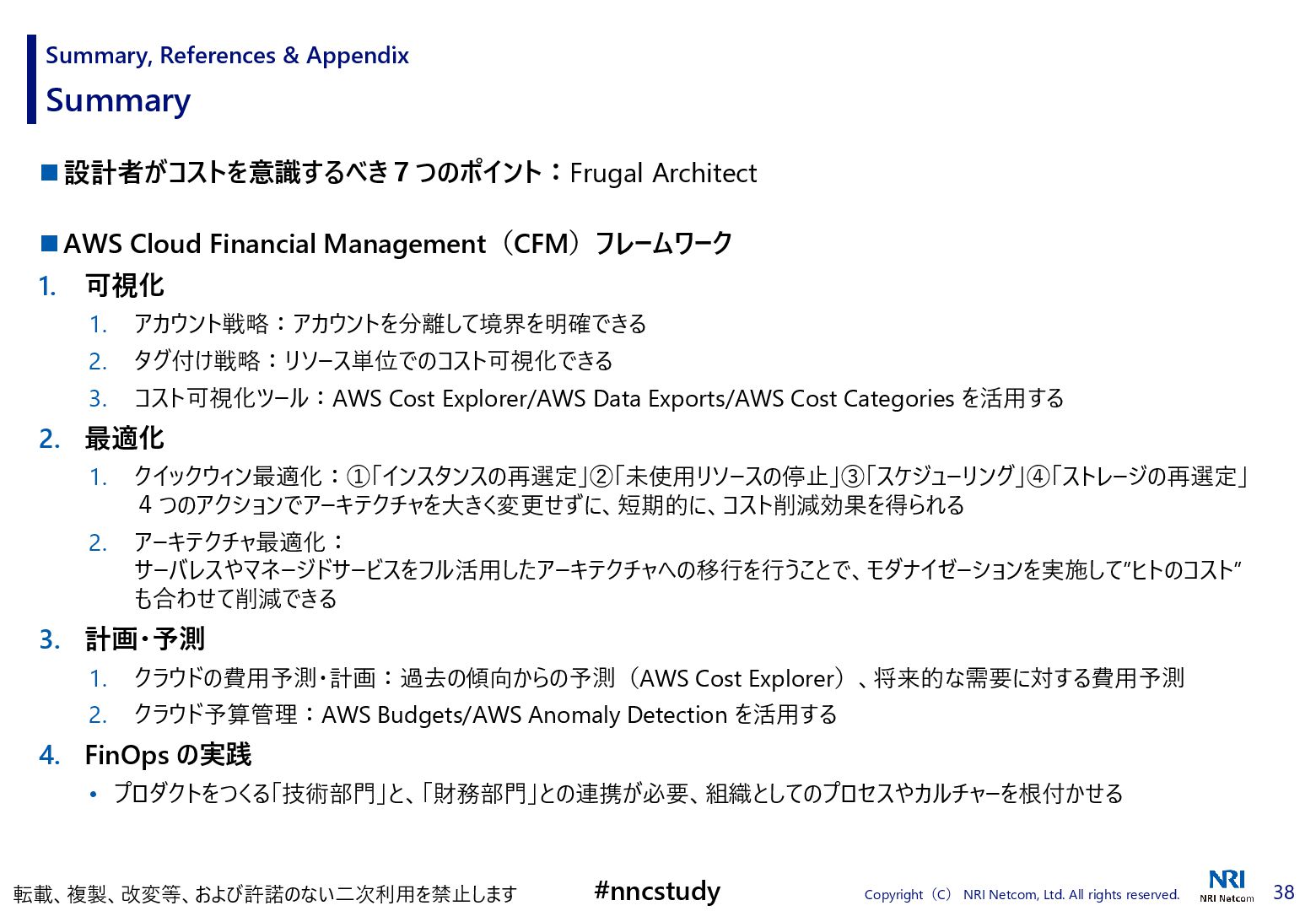References Summary, References & Appendix ◼THE FRUGAL ARCHITECT - Architects https://thefrugalarchitect.com/architects/ ◼クラウド財務管理はコスト削減以上のメリットをもたらす https://aws.amazon.com/jp/blogs/news/aws-cost-optimization-guidebook/ ◼新しいコスト最適化ハブは、推奨アクションを一元化してコストを節約します https://aws.amazon.com/jp/blogs/news/new-cost-optimization-hub-to-find-all-recommended- actions-in-one-place-for-saving-you-money/