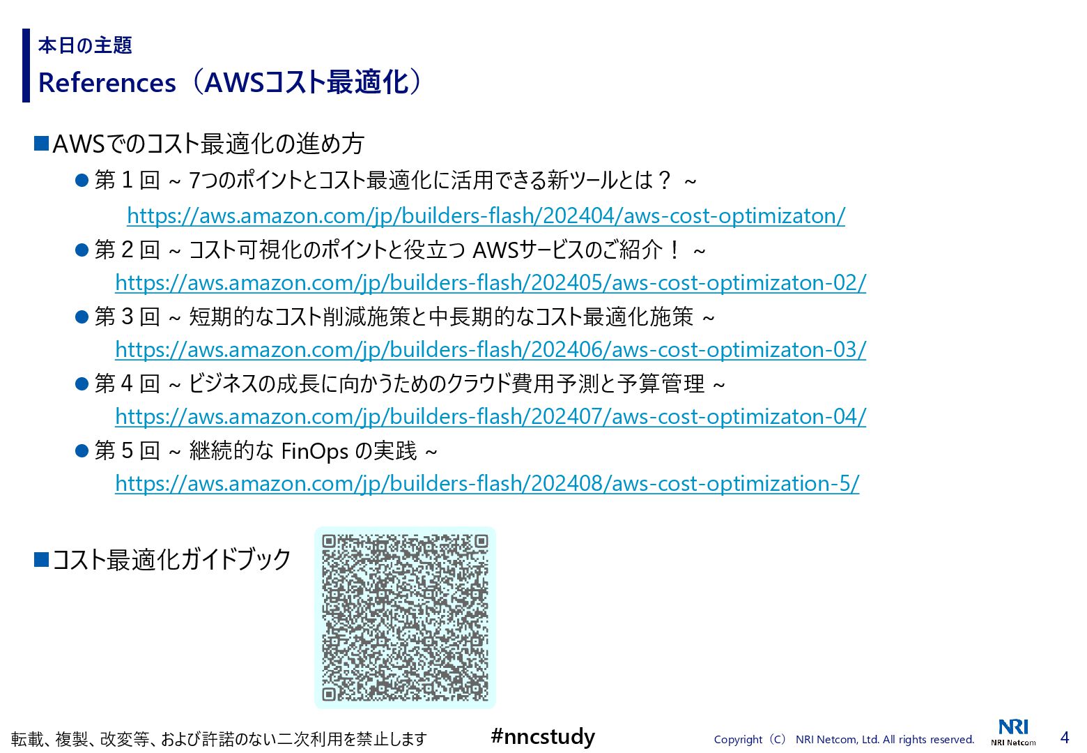 References(AWSコスト最適化) 本日の主題 ◼AWSでのコスト最適化の進め方 ⚫ 第1回 ~ 7つのポイントとコスト最適化に活用できる新ツールとは? ~ https://aws.amazon.com/jp/builders-flash/202404/aws-cost-optimizaton/ ⚫ 第2回 ~ コスト可視化のポイントと役立つ AWSサービスのご紹介! ~ https://aws.amazon.com/jp/builders-flash/202405/aws-cost-optimizaton-02/ ⚫ 第3回 ~ 短期的なコスト削減施策と中長期的なコスト最適化施策 ~ https://aws.amazon.com/jp/builders-flash/202406/aws-cost-optimizaton-03/ ⚫ 第4回 ~ ビジネスの成長に向かうためのクラウド費用予測と予算管理 ~ https://aws.amazon.com/jp/builders-flash/202407/aws-cost-optimizaton-04/ ⚫ 第5回 ~ 継続的な FinOps の実践 ~ https://aws.amazon.com/jp/builders-flash/202408/aws-cost-optimization-5/ ◼コスト最適化ガイドブック