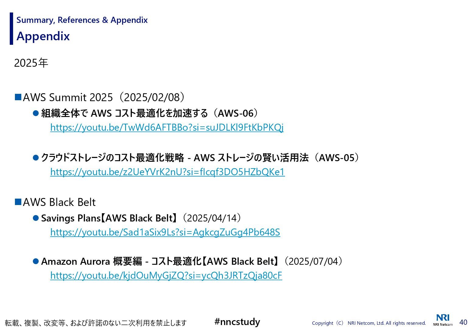 Appendix Summary, References & Appendix 2025年 ◼AWS Summit 2025(2025/02/08) ⚫ 組織全体で AWS コスト最適化を加速する(AWS-06) https://youtu.be/TwWd6AFTBBo?si=suJDLKl9FtKbPKQj ⚫ クラウドストレージのコスト最適化戦略 - AWS ストレージの賢い活用法(AWS-05) https://youtu.be/z2UeYVrK2nU?si=fIcqf3DO5HZbQKe1 ◼AWS Black Belt ⚫ Savings Plans【AWS Black Belt】(2025/04/14) https://youtu.be/Sad1aSix9Ls?si=AgkcgZuGg4Pb648S ⚫ Amazon Aurora 概要編 - コスト最適化【AWS Black Belt】(2025/07/04) https://youtu.be/kjdOuMyGjZQ?si=ycQh3JRTzQja80cF