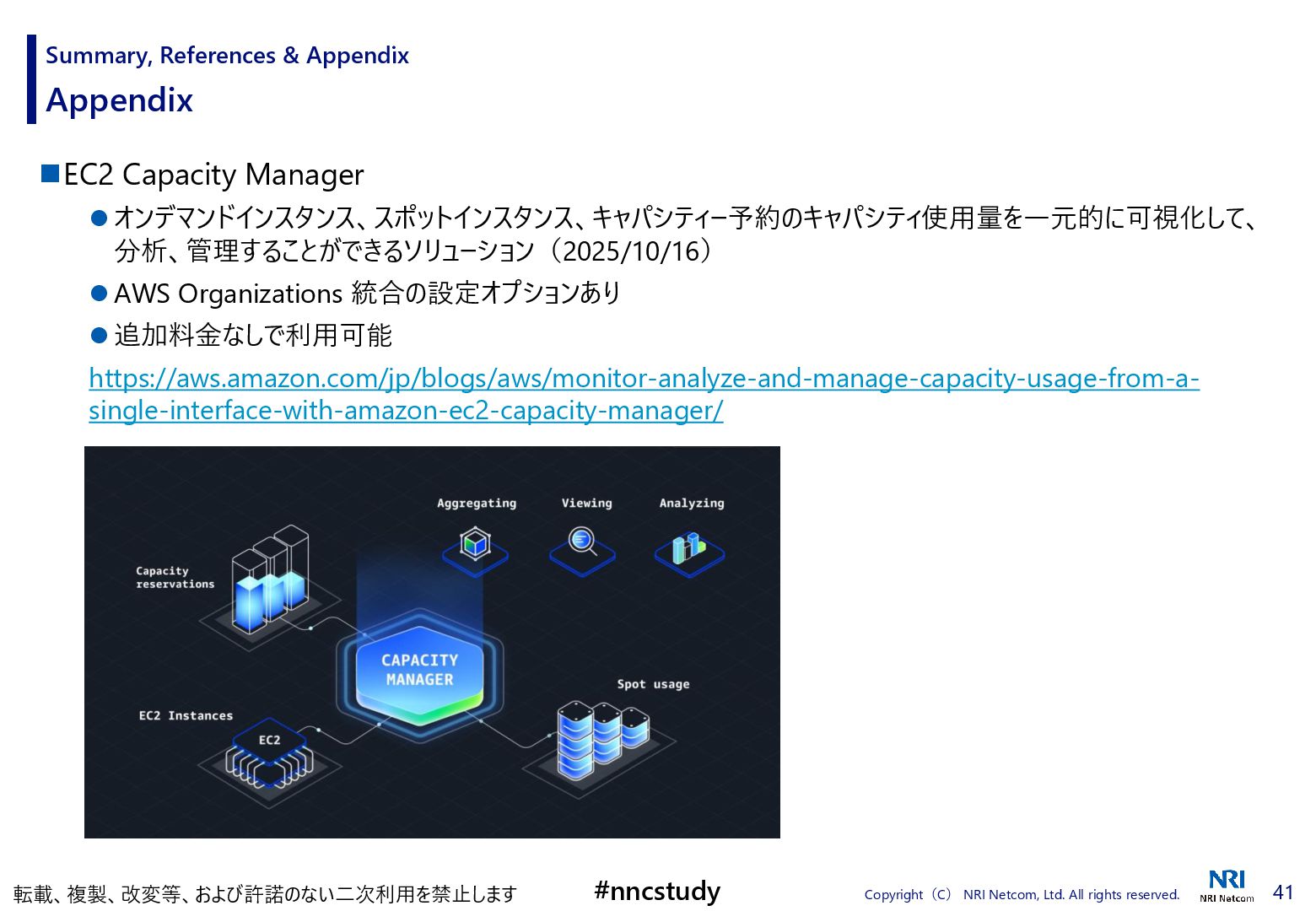 Appendix Summary, References & Appendix ◼EC2 Capacity Manager ⚫ オンデマンドインスタンス、スポットインスタンス、キャパシティー予約のキャパシティ使用量を一元的に可視化して、 分析、管理することができるソリューション(2025/10/16) ⚫ AWS Organizations 統合の設定オプションあり ⚫ 追加料金なしで利用可能 https://aws.amazon.com/jp/blogs/aws/monitor-analyze-and-manage-capacity-usage-from-a- single-interface-with-amazon-ec2-capacity-manager/