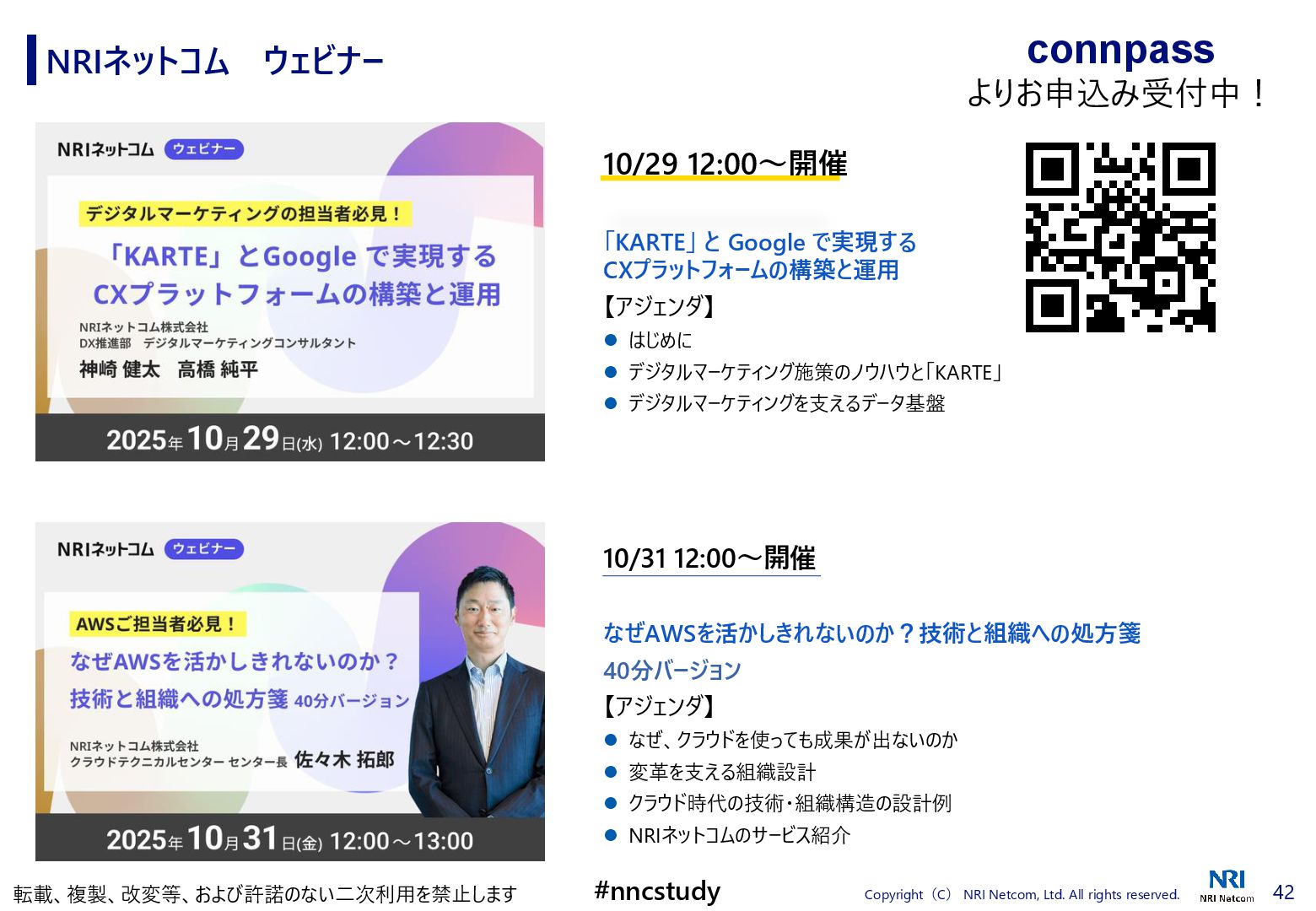 NRIネットコム ウェビナー 10/29 12:00~開催 「KARTE」 と Google で実現する CXプラットフォームの構築と運用 【アジェンダ】 ⚫ はじめに ⚫ デジタルマーケティング施策のノウハウと「KARTE」 ⚫ デジタルマーケティングを支えるデータ基盤 10/31 12:00~開催 なぜAWSを活かしきれないのか?技術と組織への処方箋 40分バージョン 【アジェンダ】 ⚫ なぜ、クラウドを使っても成果が出ないのか ⚫ 変革を支える組織設計 ⚫ クラウド時代の技術・組織構造の設計例 ⚫ NRIネットコムのサービス紹介 connpass よりお申込み受付中!