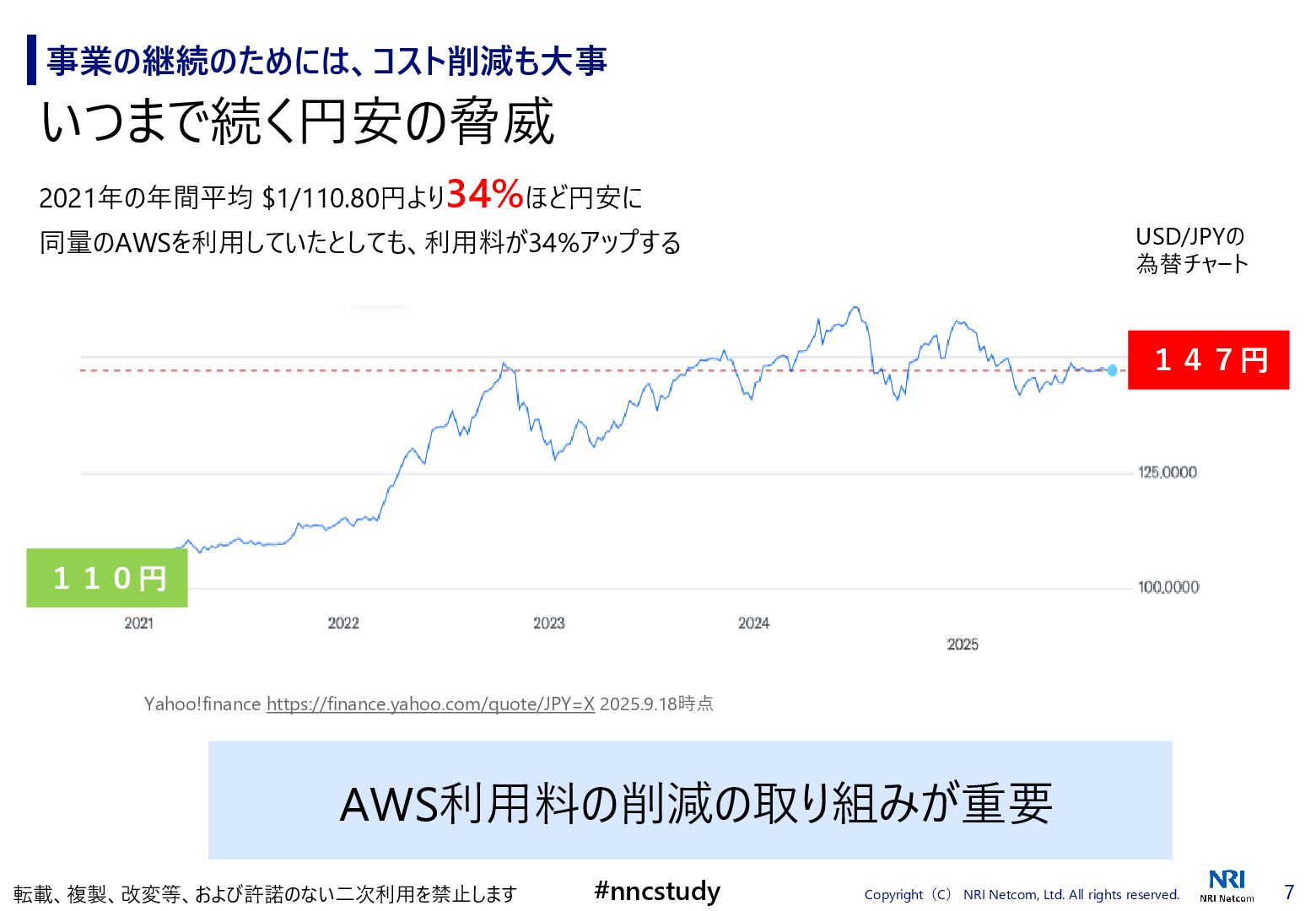 事業の継続のためには、コスト削減も大事 Yahoo!finance https://finance.yahoo.com/quote/JPY=X 2025.9.18時点 いつまで続く円安の脅威 2021年の年間平均 $1/110.80円より34%ほど円安に 同量のAWSを利用していたとしても、利用料が34%アップする USD/JPYの 為替チャート AWS利用料の削減の取り組みが重要 110円 147円