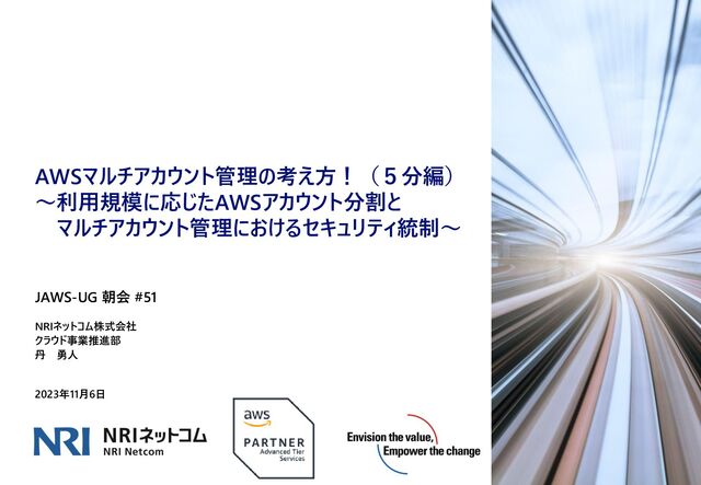 AWSマルチアカウント管理の考え方!(5分編) ~利用規模に応じたAWSアカウント分割と マルチアカウント管理におけるセキュリティ統制~ 2023年11月6日 NRIネットコム株式会社 クラウド事業推進部 丹 勇人 JAWS-UG 朝会