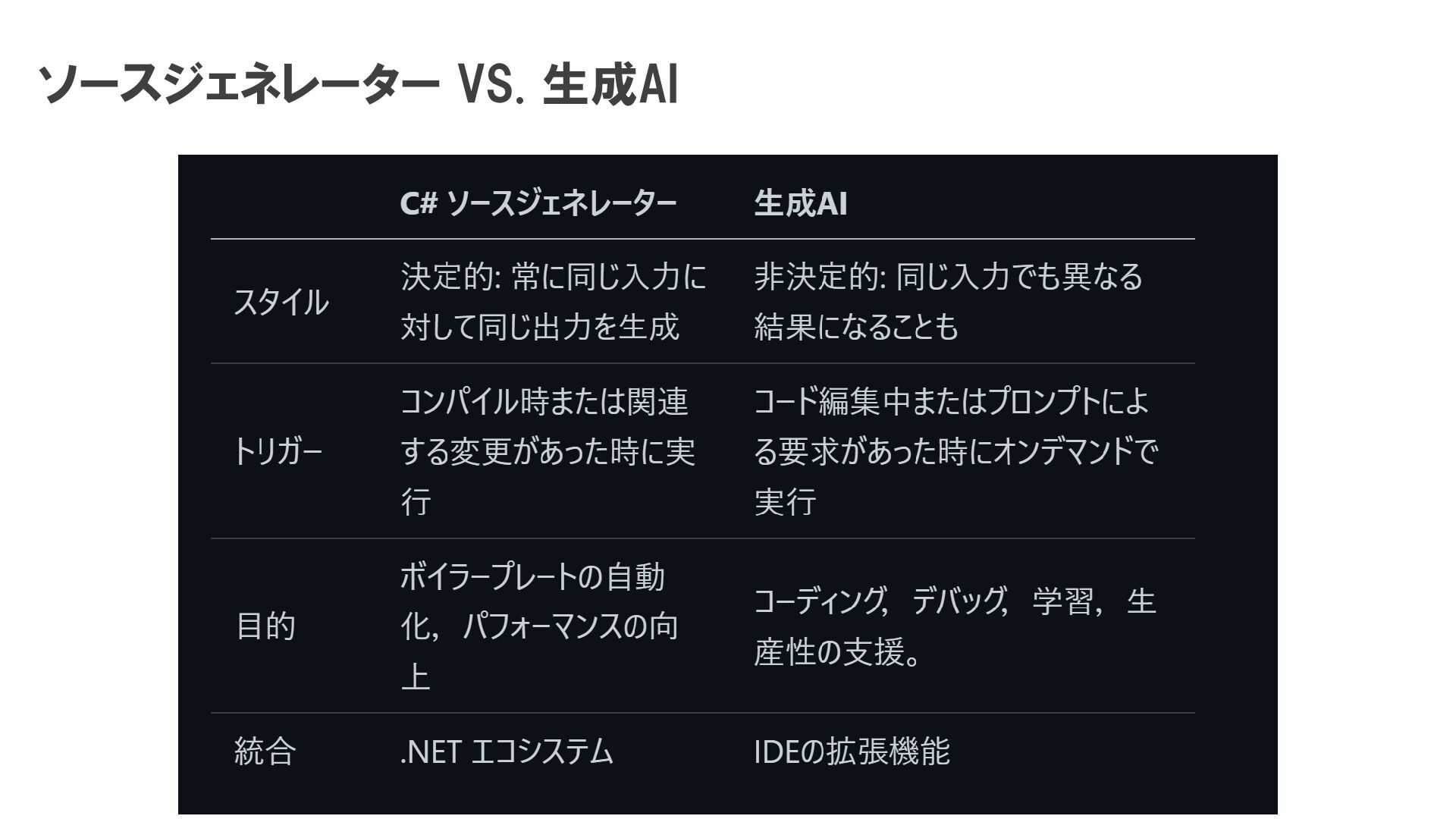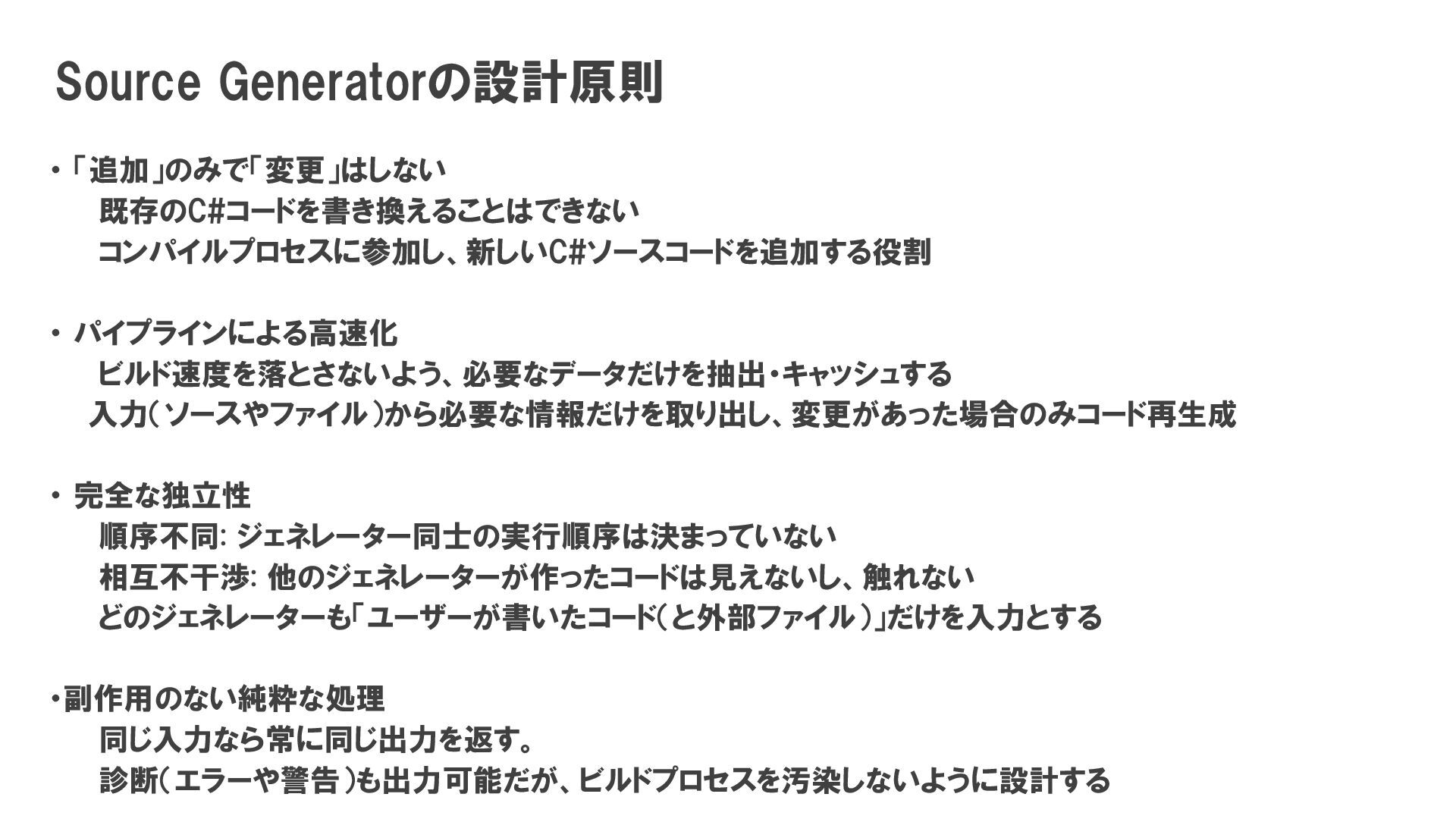 ・ 完全な独立性 順序不同: ジェネレーター同士の実行順序は決まっていない 相互不干渉: 他のジェネレーターが作ったコードは見えないし、触れない どのジェネレーターも「ユーザーが書いたコード(と外部ファイル)」だけを入力とする ・副作用のない純粋な処理 同じ入力なら常に同じ出力を返す。 診断(エラーや警告)も出力可能だが、ビルドプロセスを汚染しないように設計する