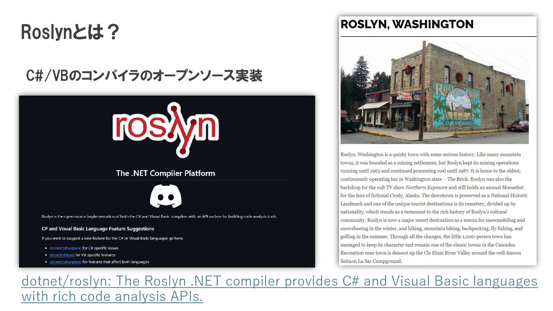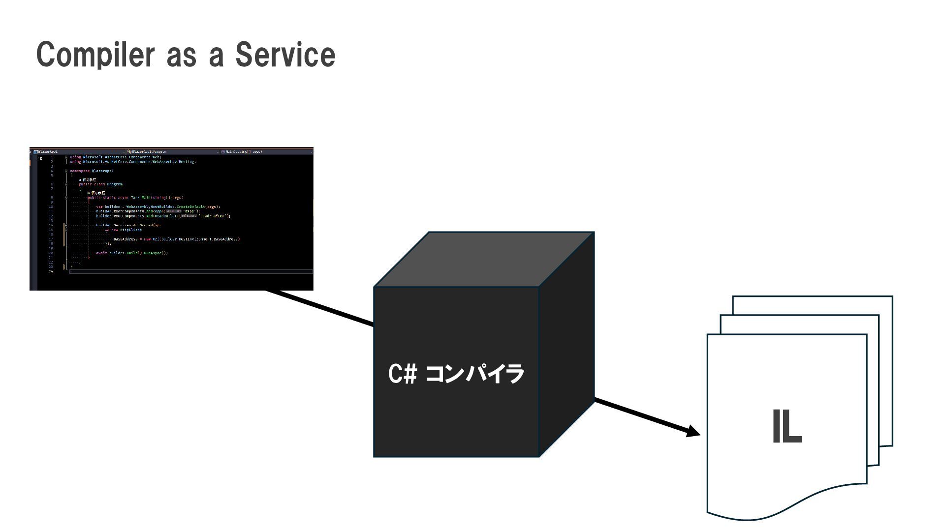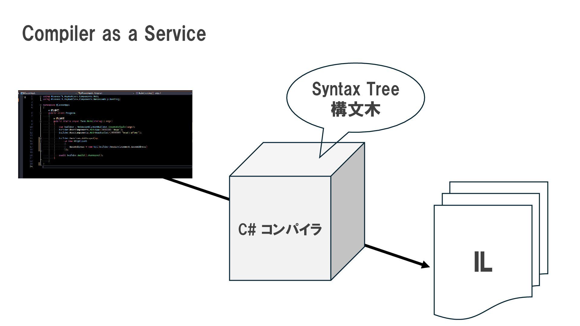 を作ったりする. スクリプティング 属性 (Attributes) コンパイラやフレームワーク に対して「これはこういう扱 いをしてね」という追加情報 を伝える コンパイル時には決まってい ないメソッドやプロパティに 対して、実行時にアクセスす る.(dynamic 型など). Roslyn Scripting APIを使っ て、文字列としてのC#コード を実行時にコンパイル・実行 することも可能. 式木(Expression Tree) コード(処理ロジック)を、コ ンパイル後の命令ではなく 『データ構造(ツリー状)』とし て扱う